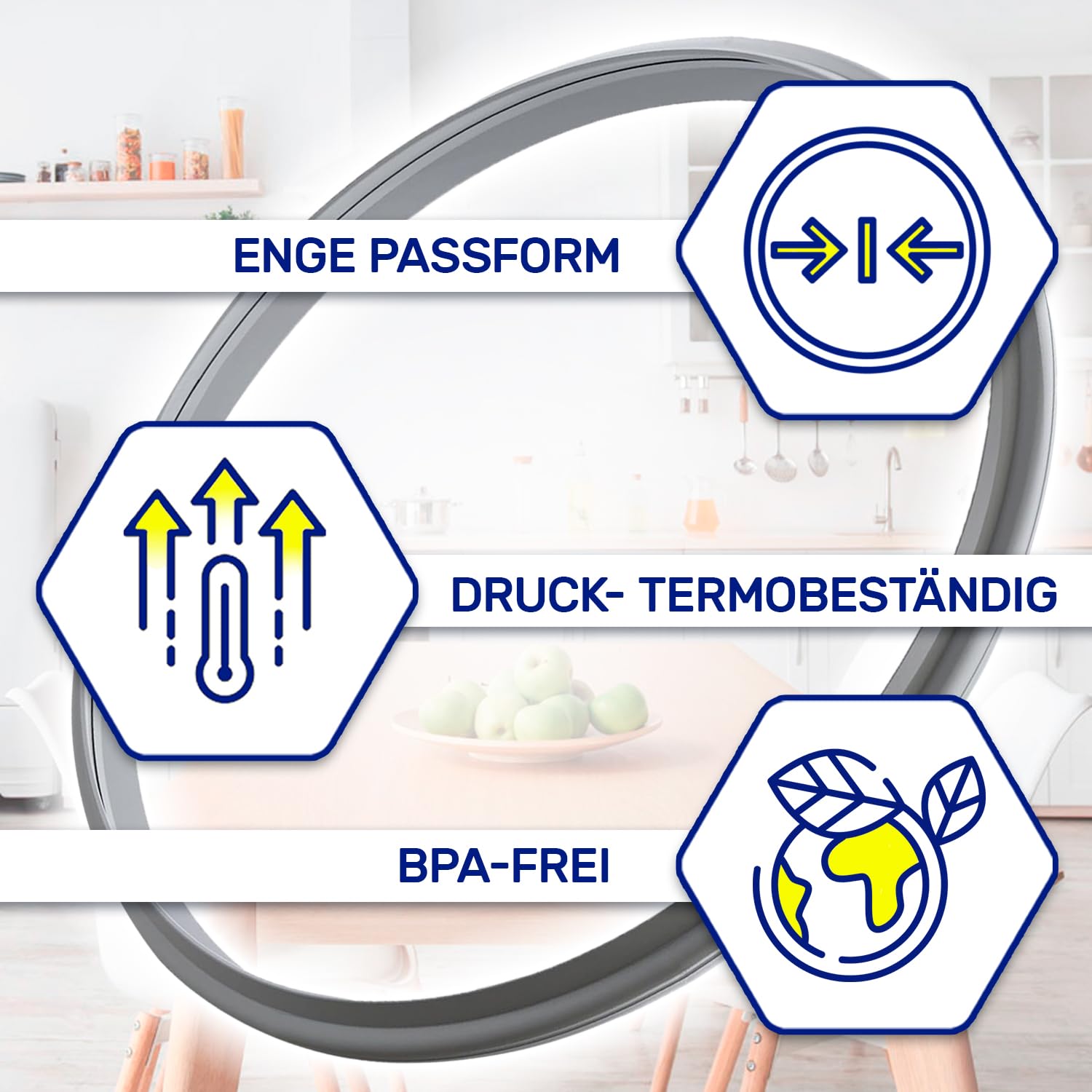 - Dichtungsring schnellkochtopf 22 cm besteht aus haltbarem, lebensmittelechtem Silikon und ist resistent gegen hohe Temperaturen. Sie beeinträchtigt nicht die Qualität, den Geruch oder den Geschmack der Lebensmittel während des Kochens.