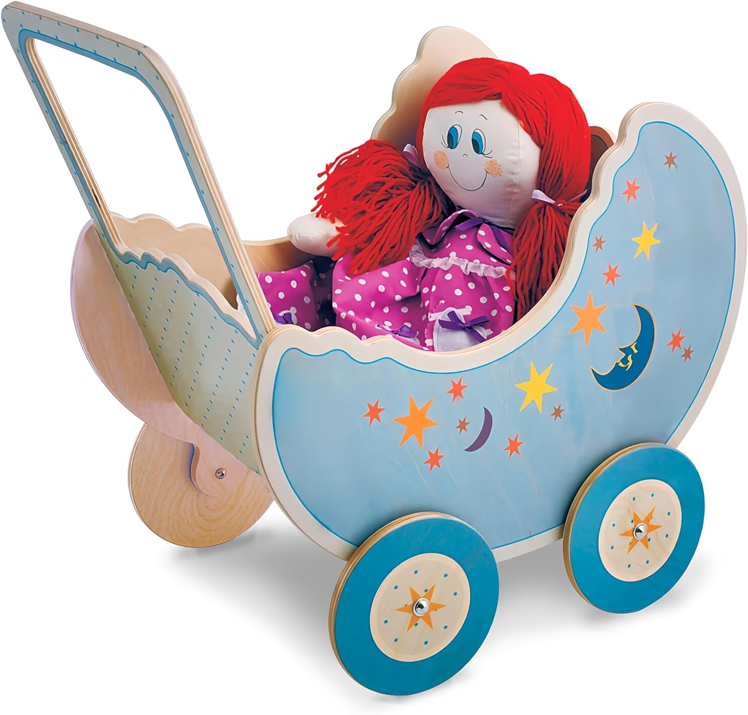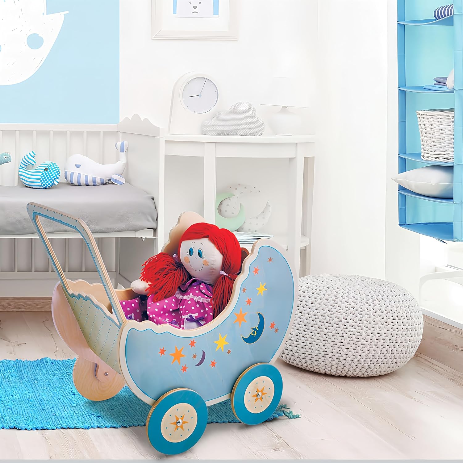 - Kinderpuppenwagen aus Holz für Puppen bis zu einer Höhe von 50 cm für Kinder ab 2 Jahren