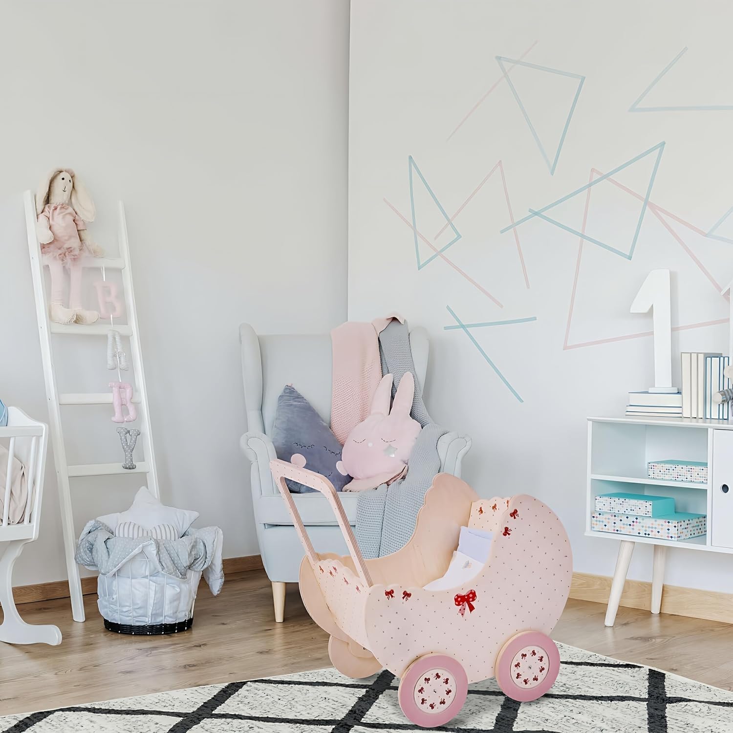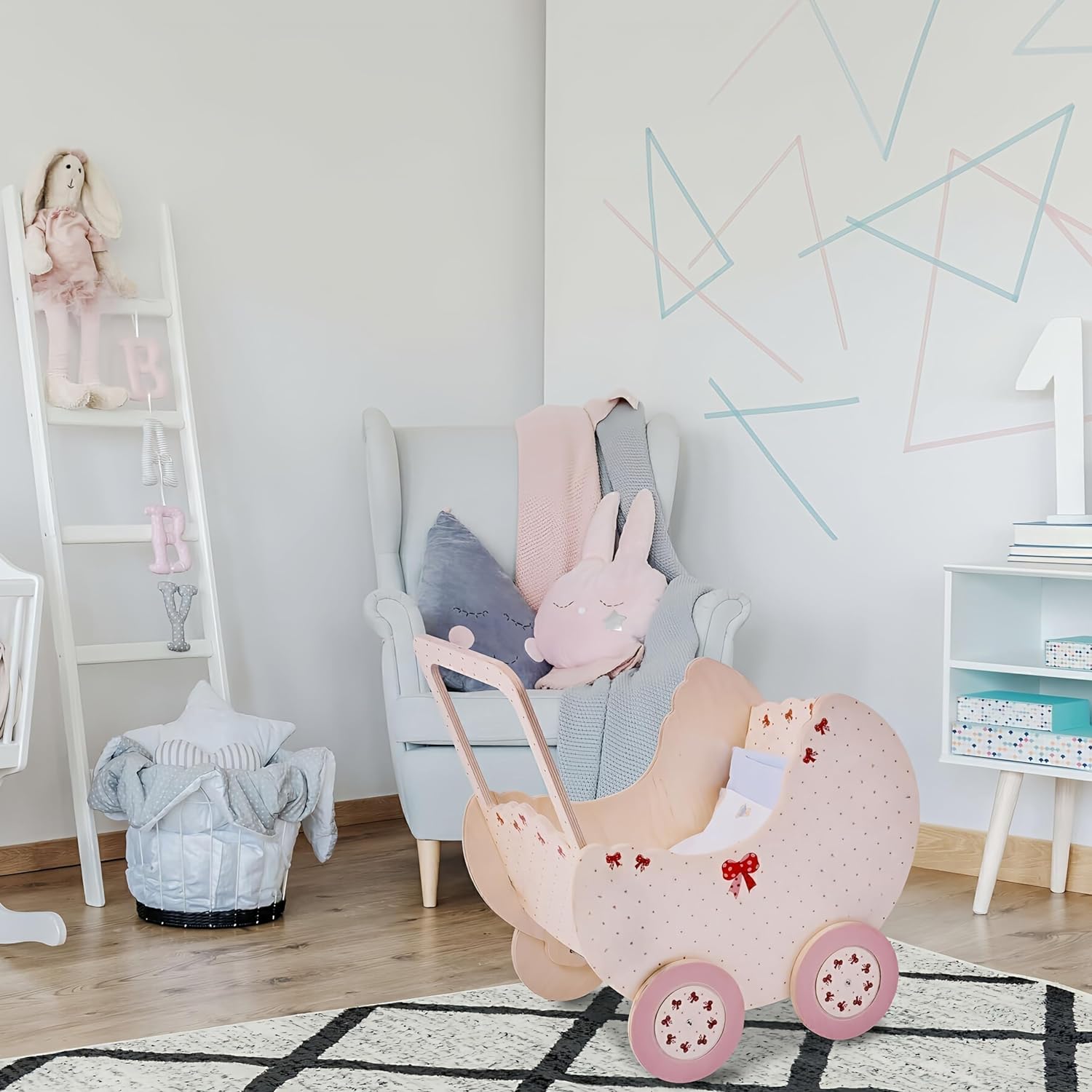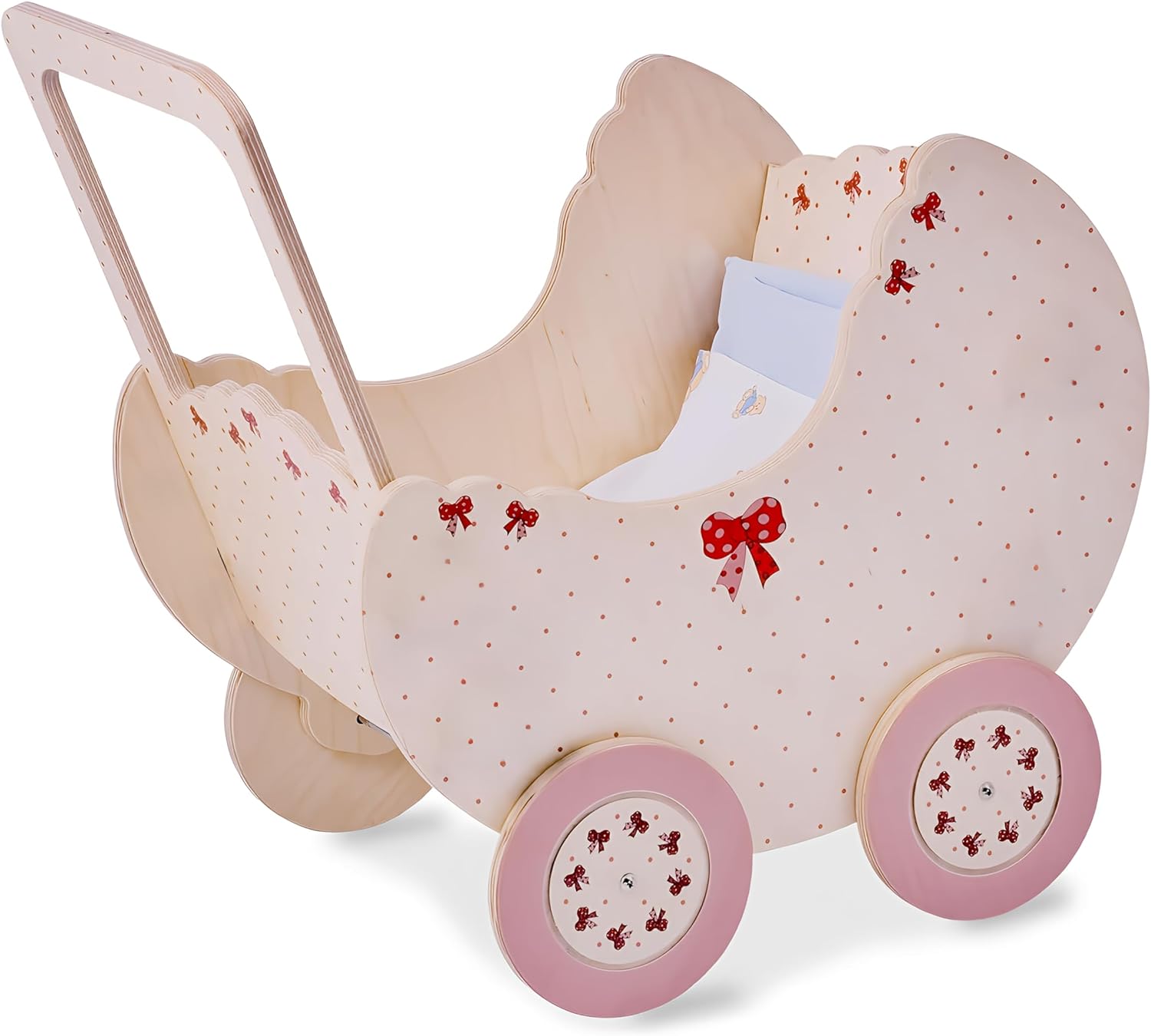 - Kinderpuppenwagen aus Holz für Puppen bis zu einer Höhe von 50 cm für Kinder ab 2 Jahren