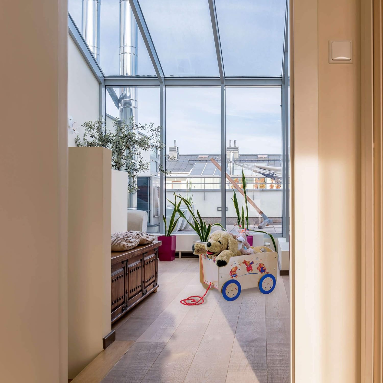 • Vielseitig und funktional: Dieser ziehbare Holzwagen hat verschiedene Funktionen. Er ist ein Spielzeugbehälter, ein Kuscheltierträger und ein Buchhalter, kann sich aber auch in einen Kinderwagen verwandeln. Kinder lieben es, von ihren Eltern von einem