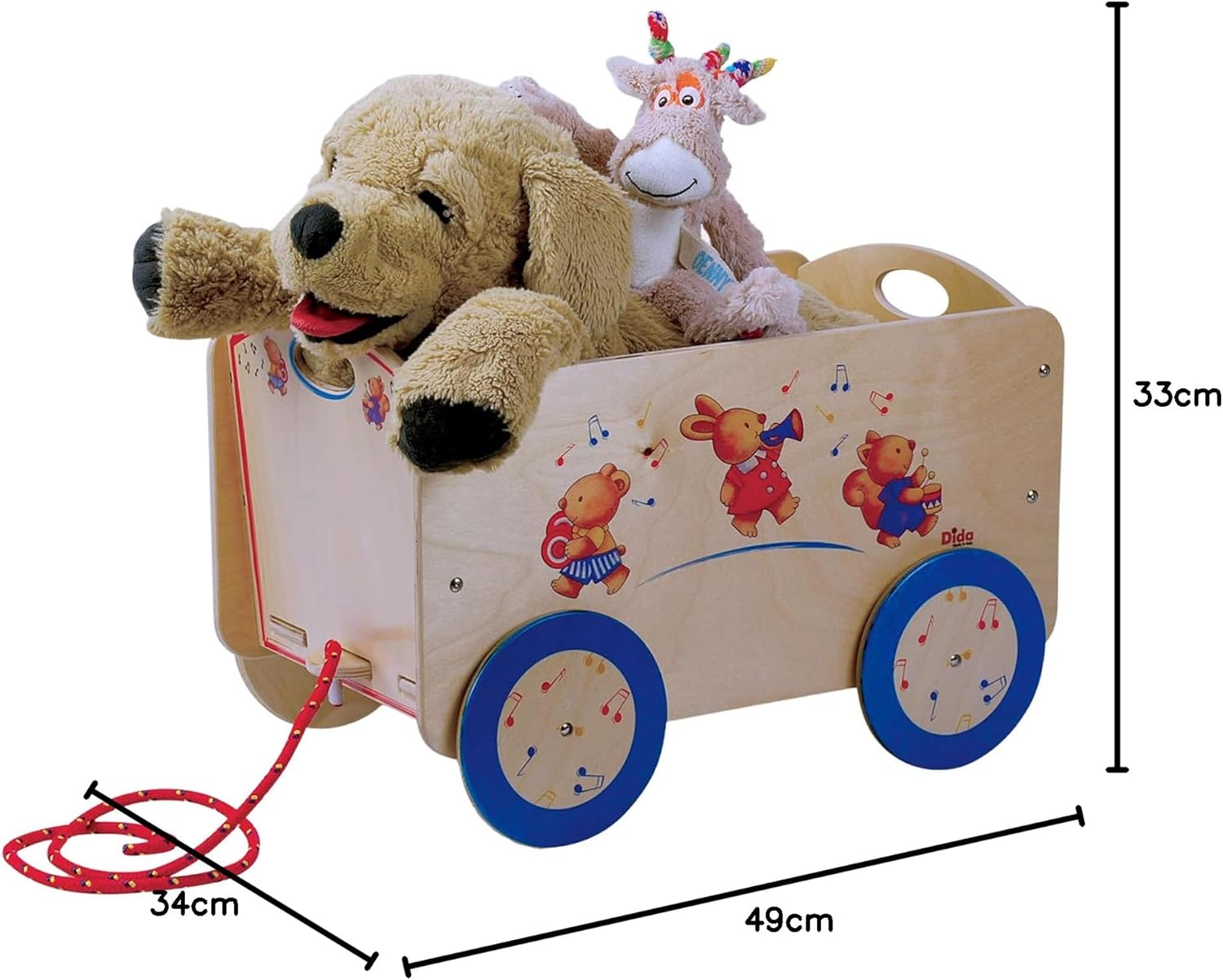 Dida - Holzwagen mit Rädern für Gegenstände und Kinderspielzeug. Dekoration: musizierende Tiere. Lei