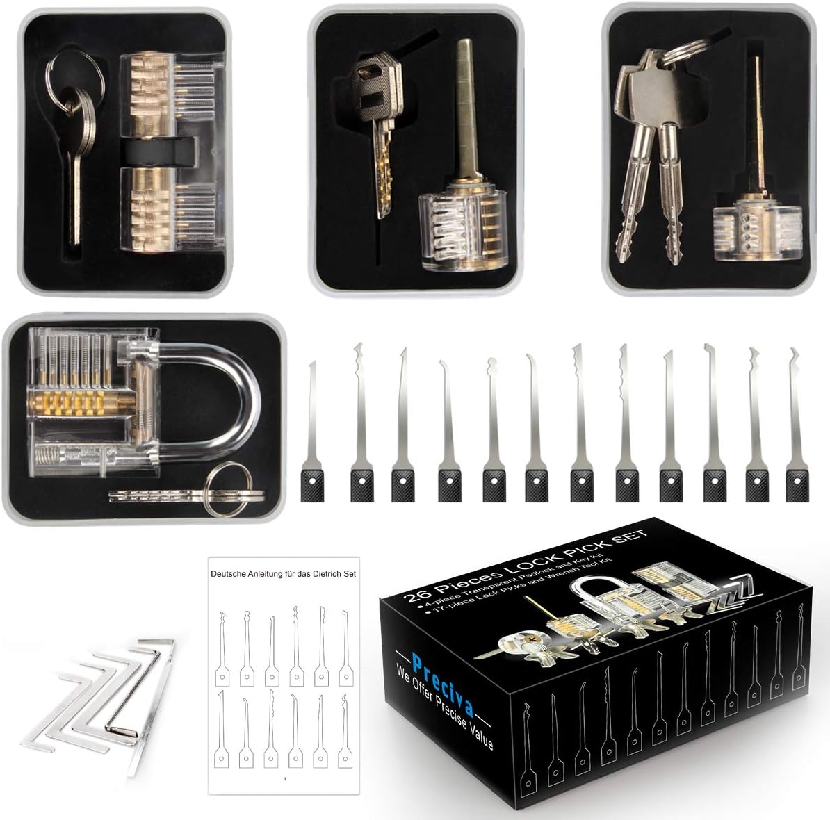 - Preciva 26 tlg. Lock Picking Set mit 4 Transparenten Übungsschlössern Dietrichen Kit für Anfänger und Professionelle Lockpicker.