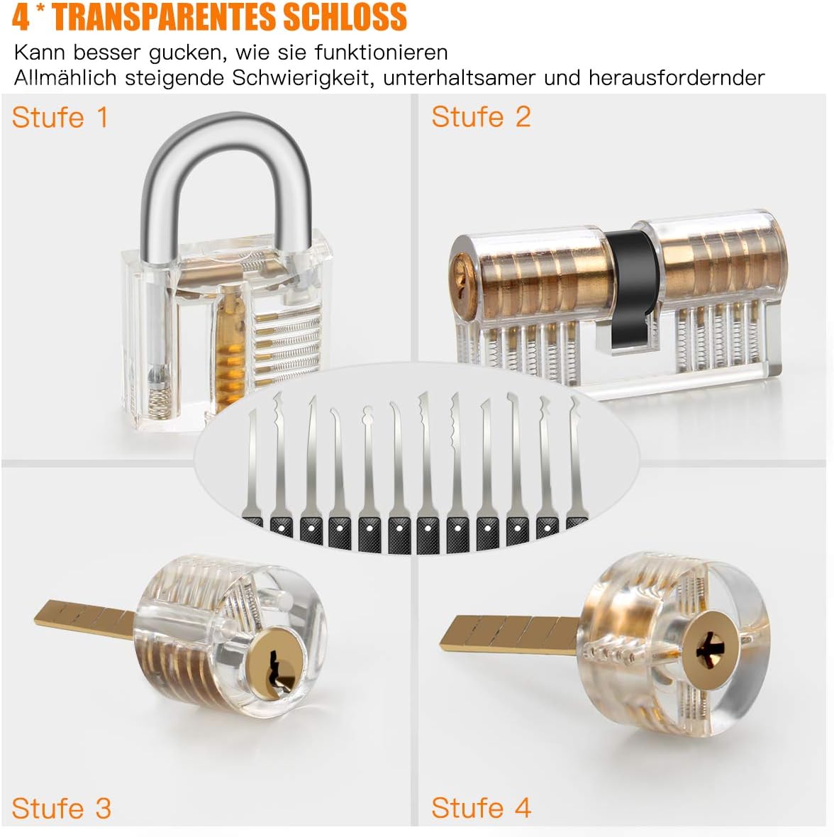 - Es sind die unterschiedlichsten Manipulationswerkzeuge für unterschiedliche Schlosstypen dabei. Wenn man den Dreh raus hat, lassen sich die Schlösser in Sekundenschnelle öffnen.
