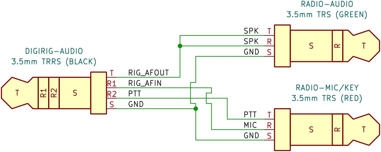 - verbinden Sie den geraden schwarzen Stecker in die Audio-Buchse von Digirig, die rote Buchse in die Mikrofonbuchse des Radios und die grüne Buchse in die Kopfhörerbuchse.
