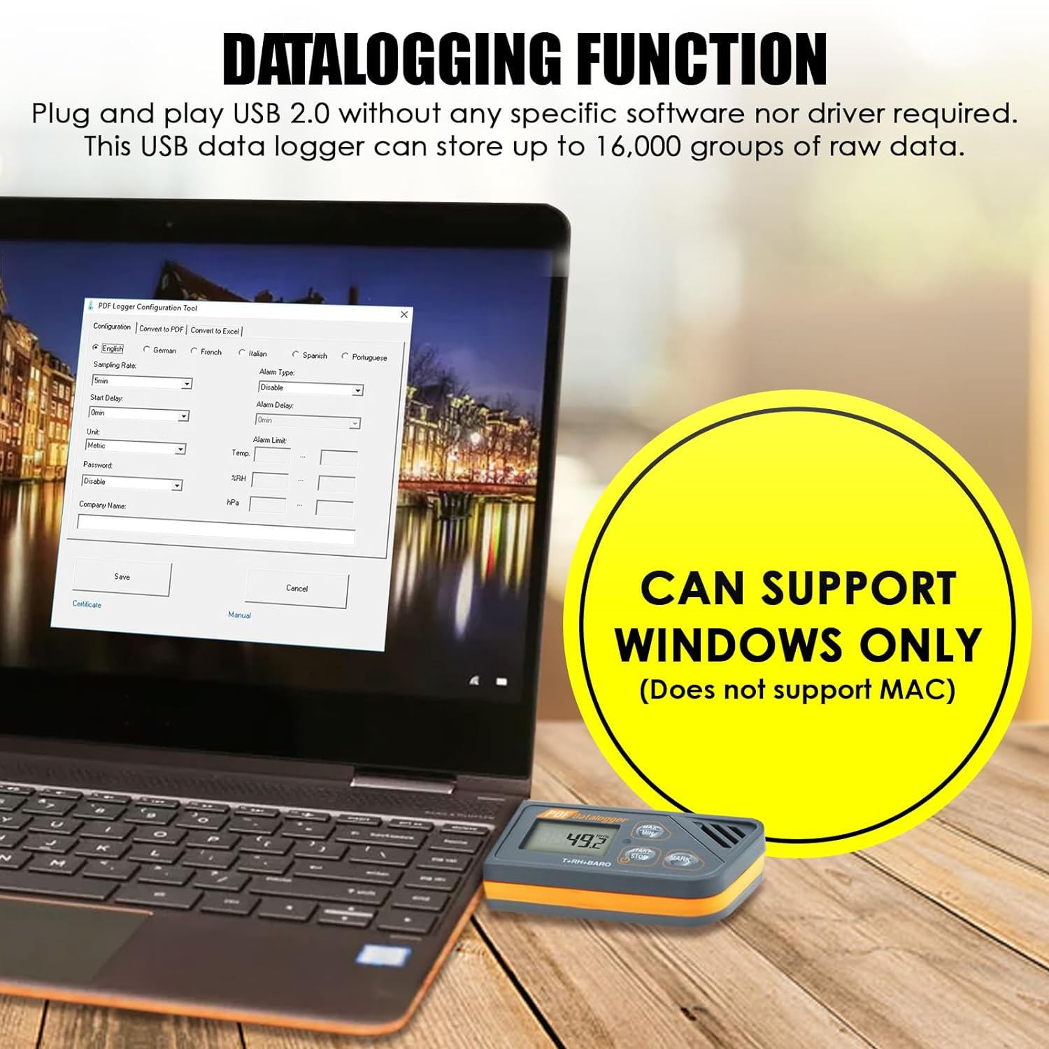 - Vollständig benutzerprogrammierbar, Sampling-Intervall-Startverzögerung, Alarmverzögerung, Einheit, Alarmanordnung, Alarmtyp, Passwort und Benutzername