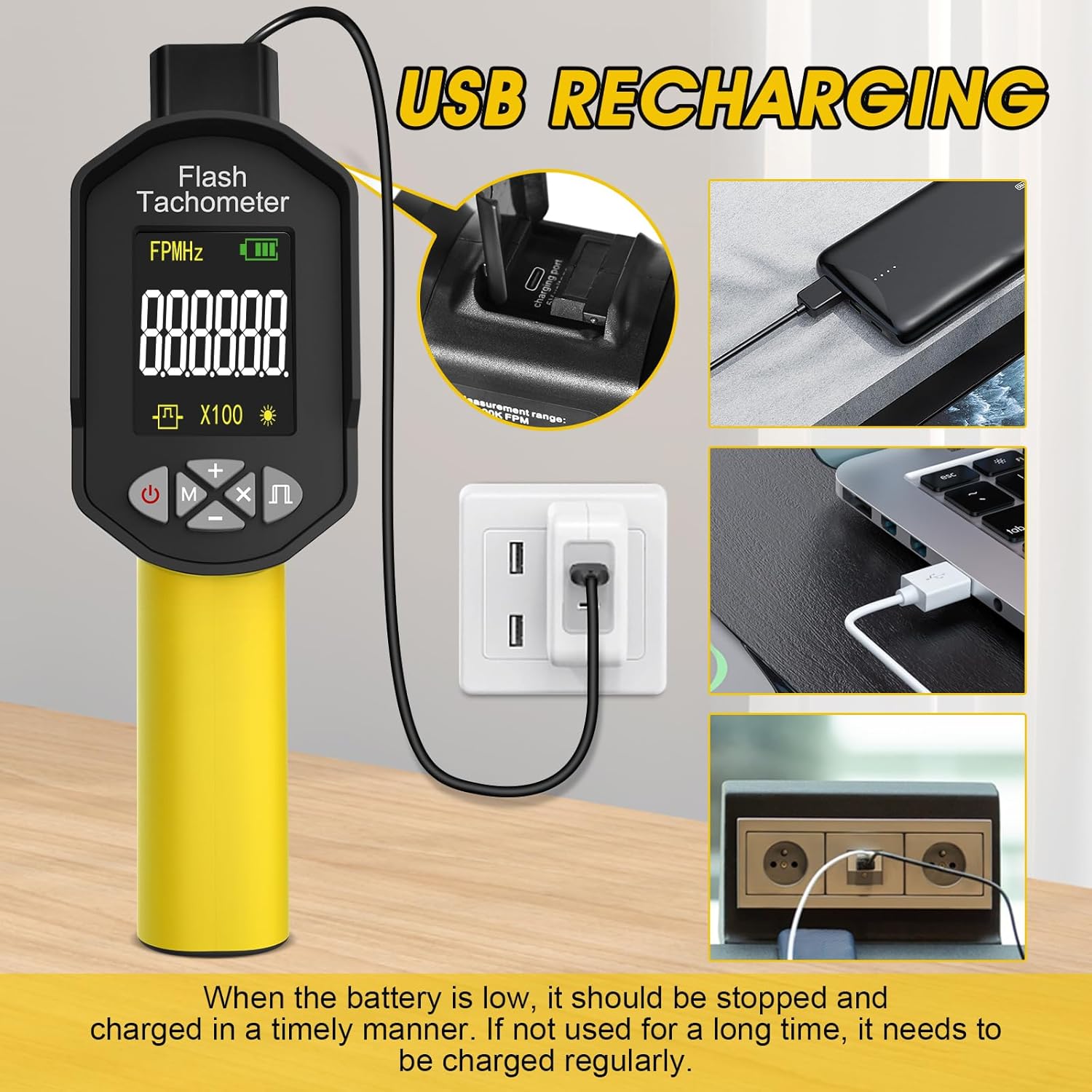 - 【Mit einer Hohen Genauigkeit von 0,001%】Strobe-Effekt kann RPM oder FPM bis zu 100000 RPM messen/beobachten,USB-Lademodus,LCD-Display,Stromverbrauch: ≤2W bei der Arbeit,Kann verwendet werden, um Multiplikator, Multiplikation und Leistung zu