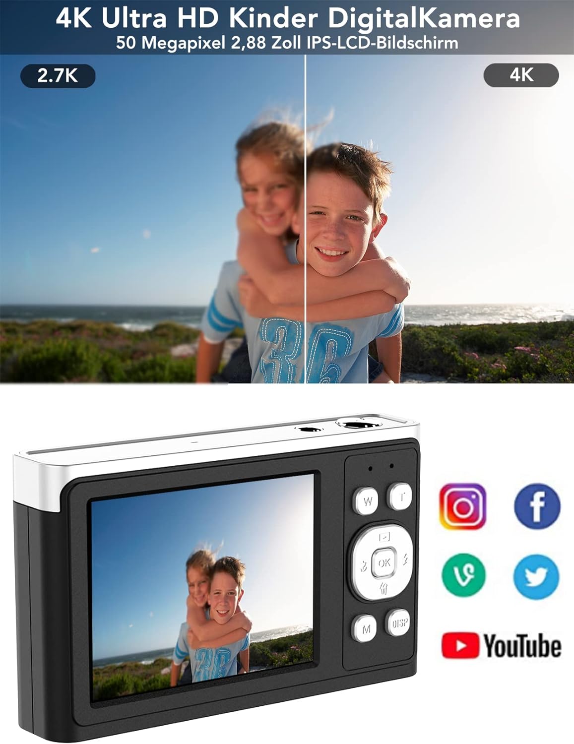 - Multifunktions-Kompaktkamera: Diese Kinderkamera mit 4K-UHD-Videoauflösung, 50 MP (max.) Bildpixel, 8 MP CMOS-Bildsensor, 2,88-Zoll-LCD-Bildschirm, 16-fachem Digitalzoom, integriertem Fülllicht, Anti-Shaking, Serienaufnahmen, Gesicht erkennen, Lächeln