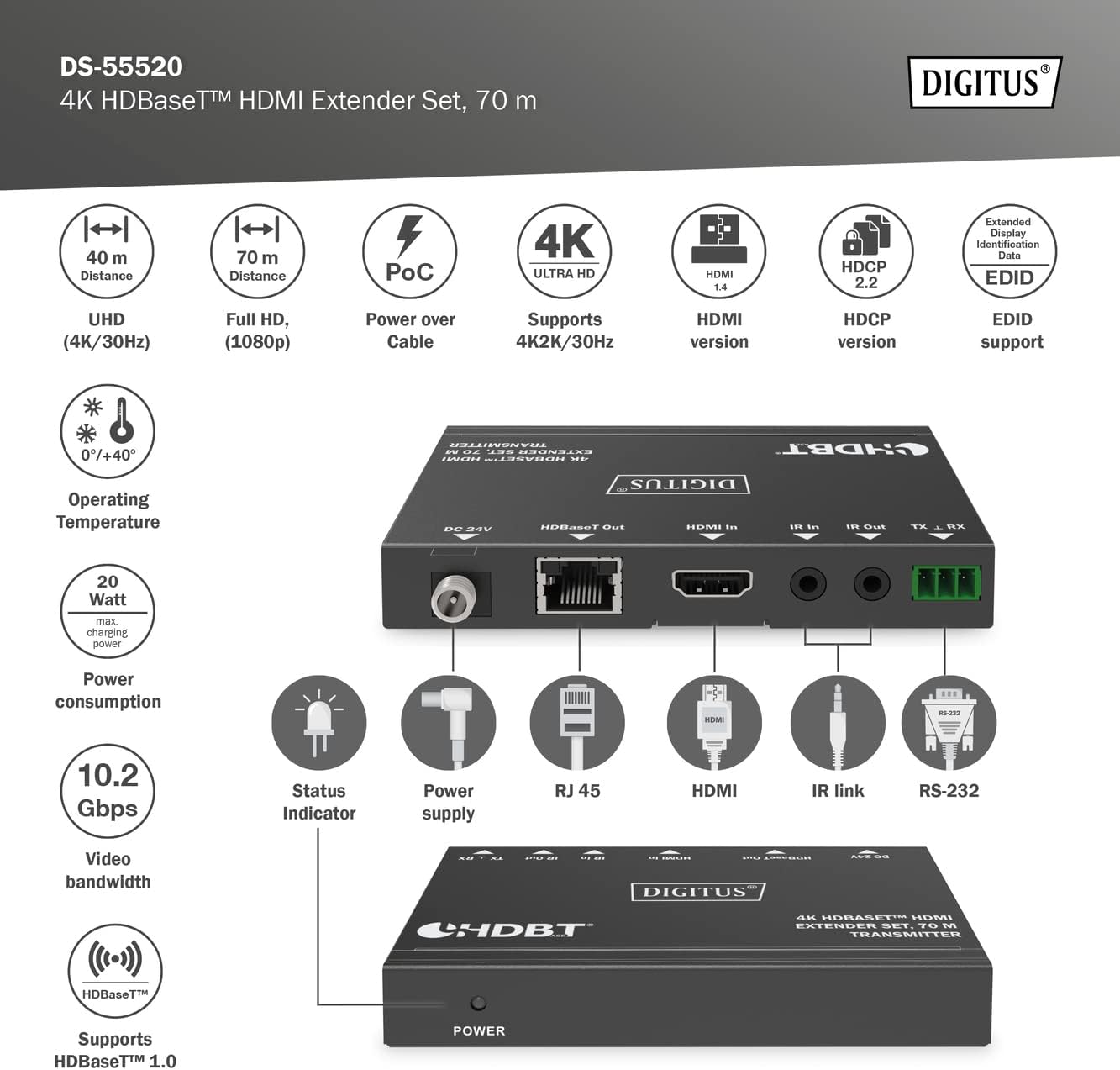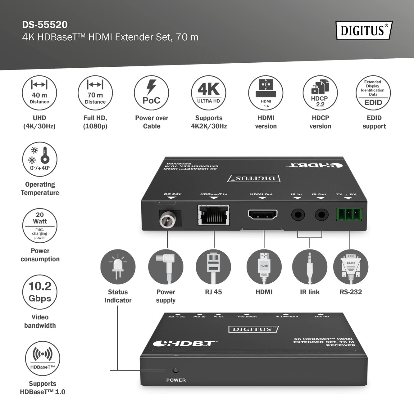 - Unterstützt HDBaseT 1.0 über CAT6/7/8 Kabel bis 70 m