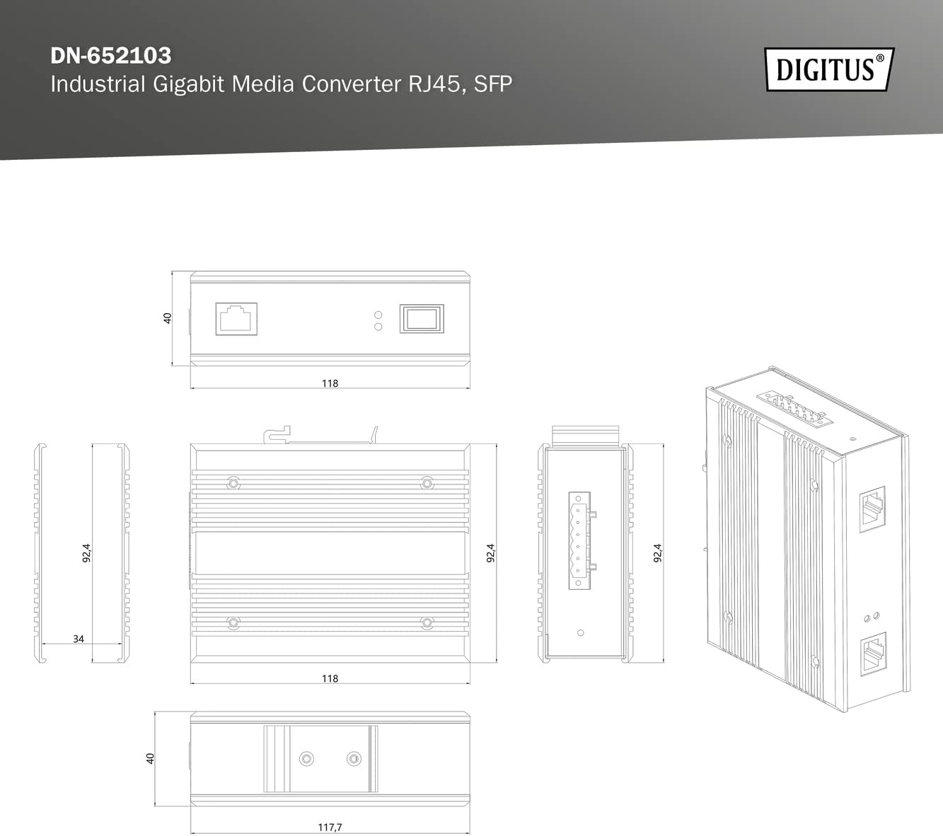 - Anschlüsse: 1x RJ45 (10/100/1000Base-TX), 1x SFP (1000Base-X)