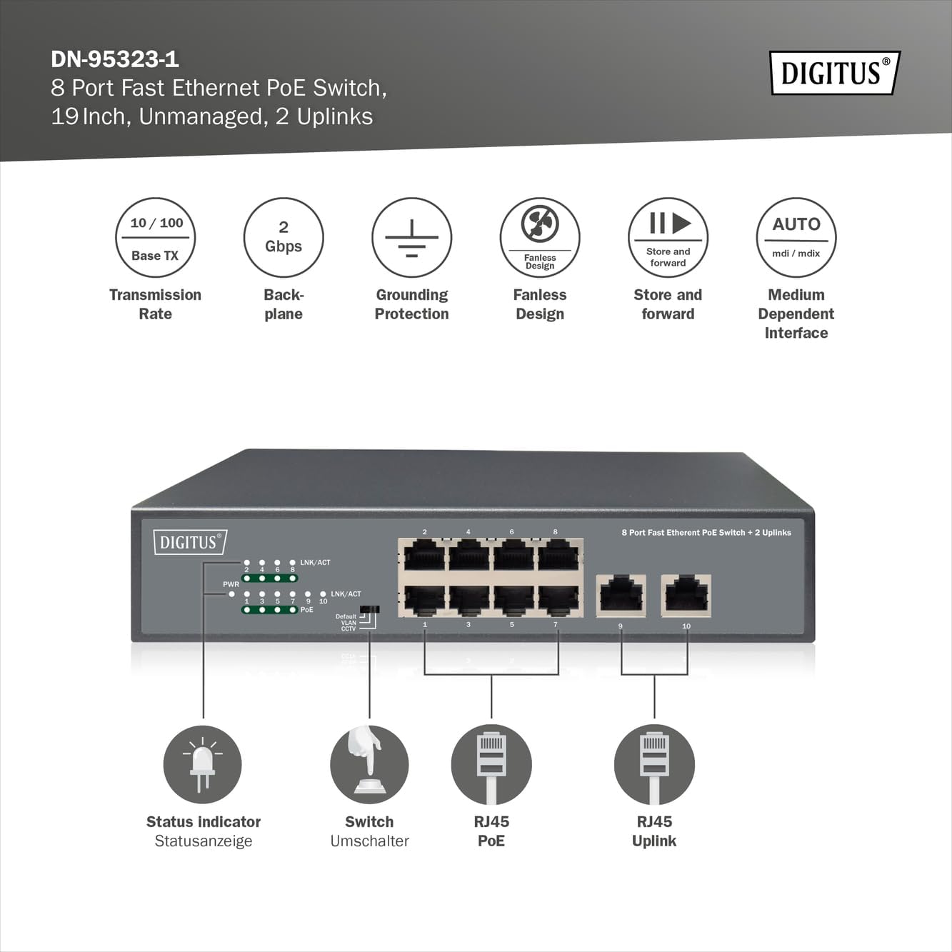 - Der PoE Netzwerk-Switch unterstützt Transferraten von bis zu 100 Mbit/s nach 10/100Base-TX an den acht RJ45-Buchsen sowie je 1 Gbit/s an den zwei zusätzliche RJ45 Uplink-Ports