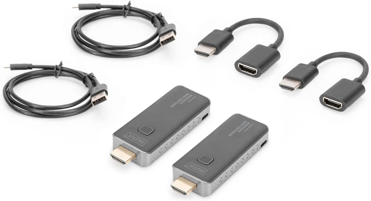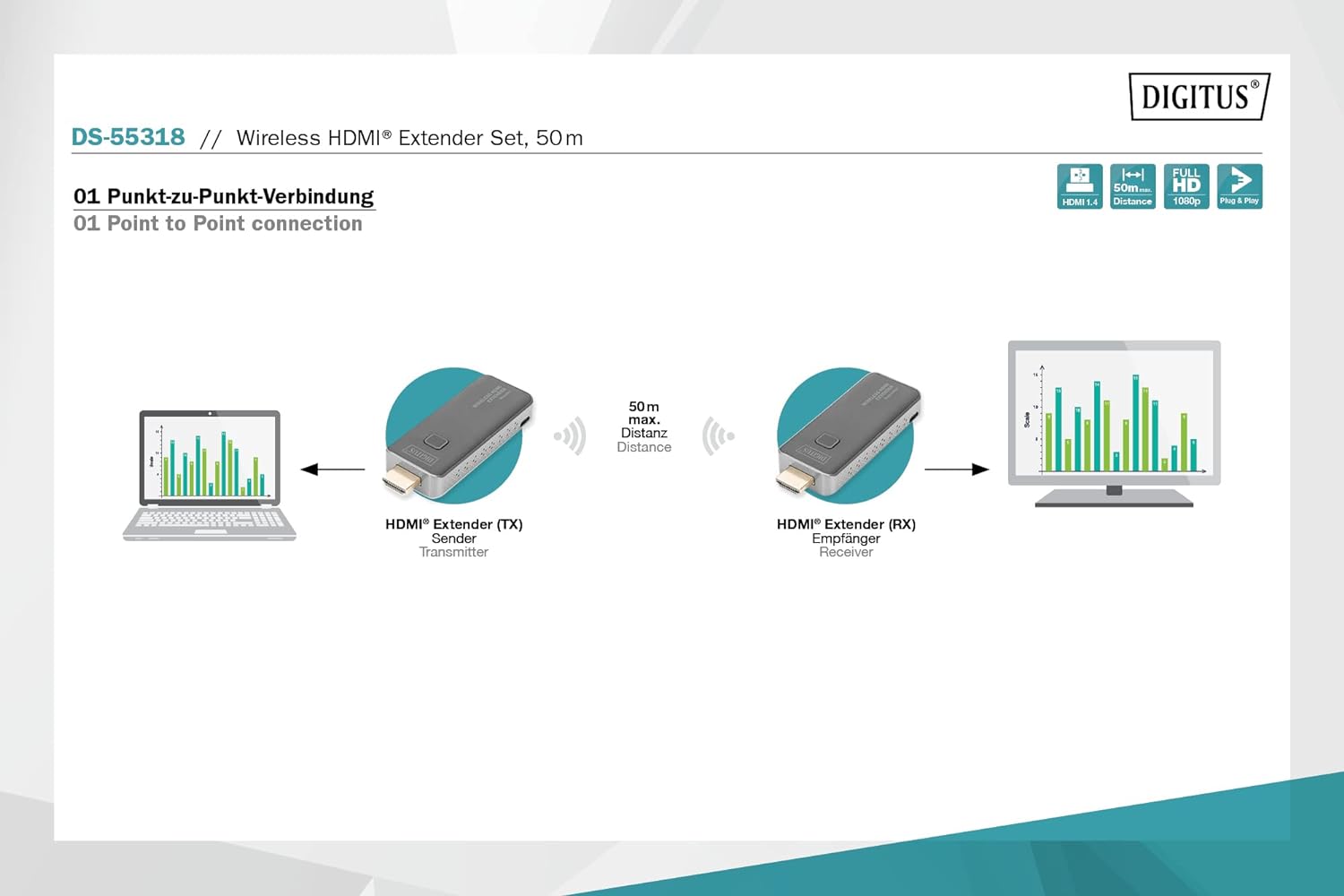 - Multimedia Übertragung: Das auf Funktechnologie basierende HDMI Extender-Set von DIGITUS überträgt Audio- & Video-Signale drahtlos in Full-HD Qualität (1080p / 60 Hz)