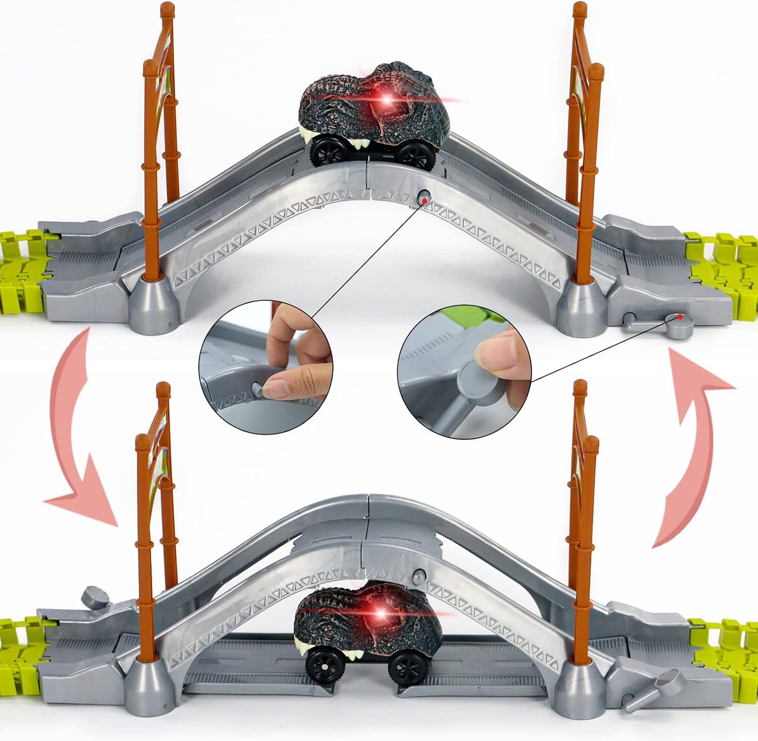 - 🌟🌟【Kinderspielzeug ab 3 4 5 6 Jahre-Abenteuer】Das kind erhält ein geschenk zum bau einer autorennbahn, und das led dino auto spielzeu pendelt auf den rennbahnen, passiert den riesigen dinosaurierkopf, öffnet die tür des dinosaurierkopfs und