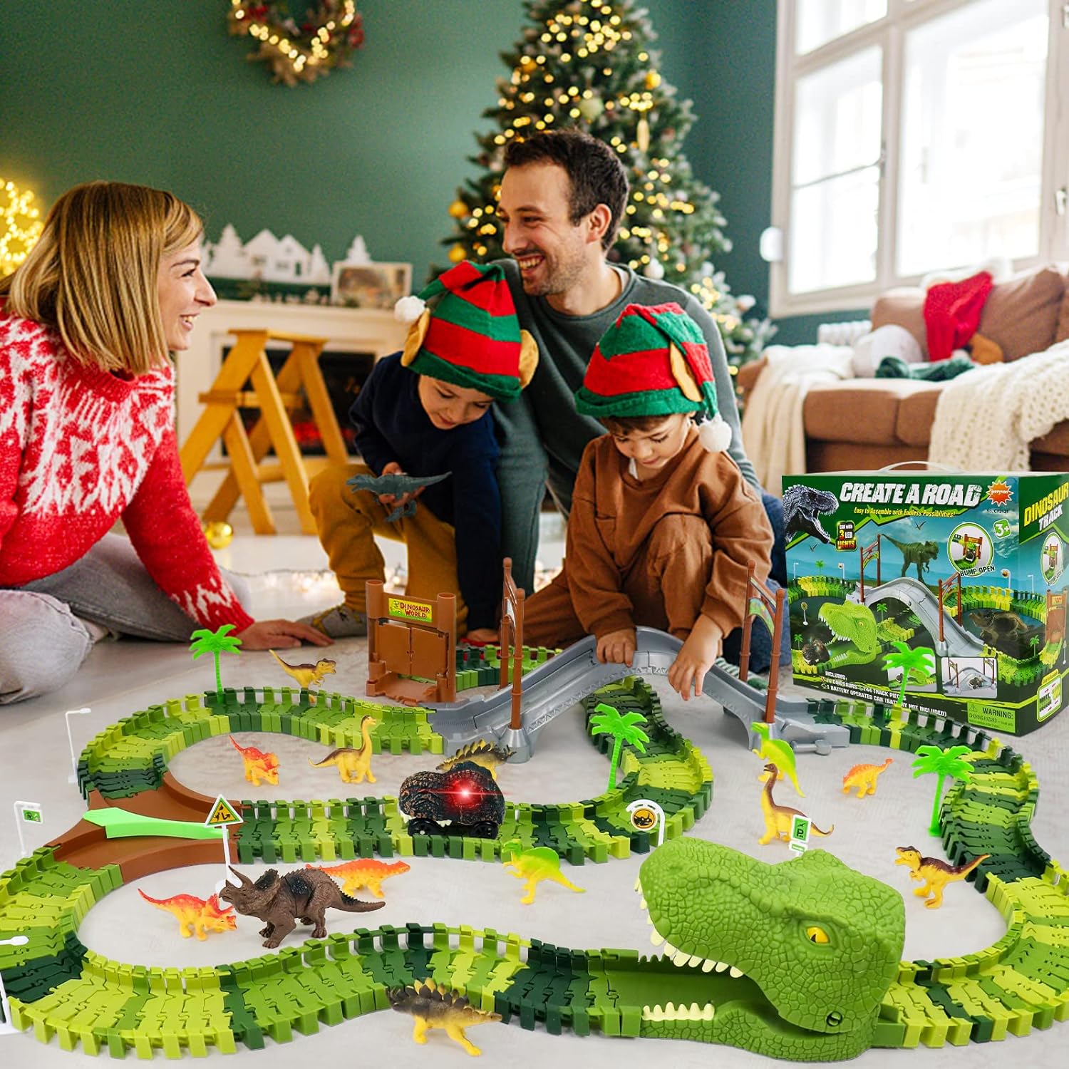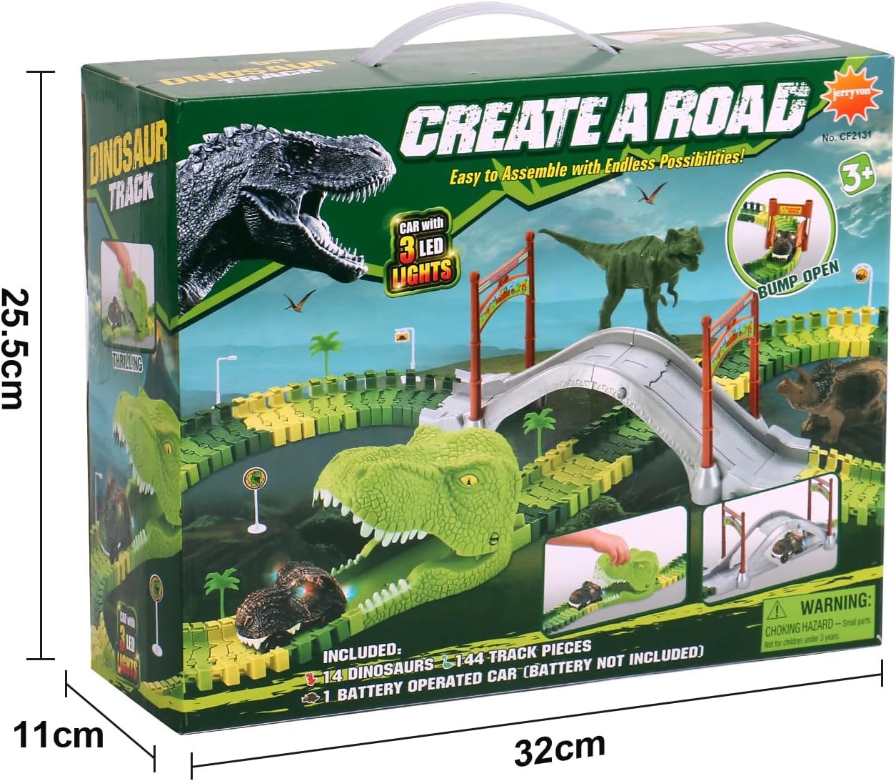- 🌟🌟【Dinosaurier Spielzeug - 185 Teile】Rennbahnen enthält 144 gleise, 14 dino spielzeug, led dino auto spielzeug, 8 verkehrszeichen, riesendinosaurierkopf, rennbahntür, vier bäume, bogenbrücke, 2 bogentüren, 4 reifen, 4 sockel, gabeln,