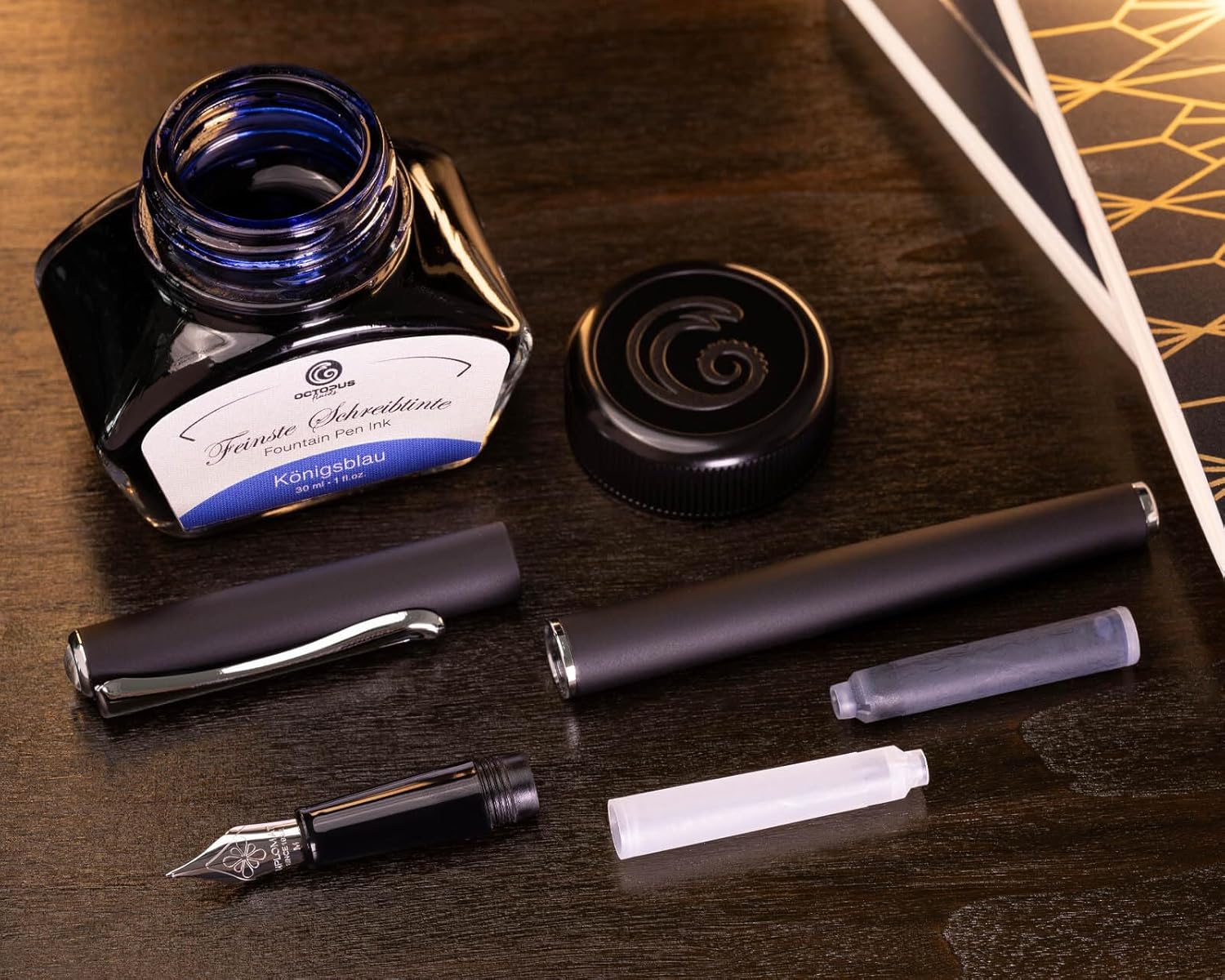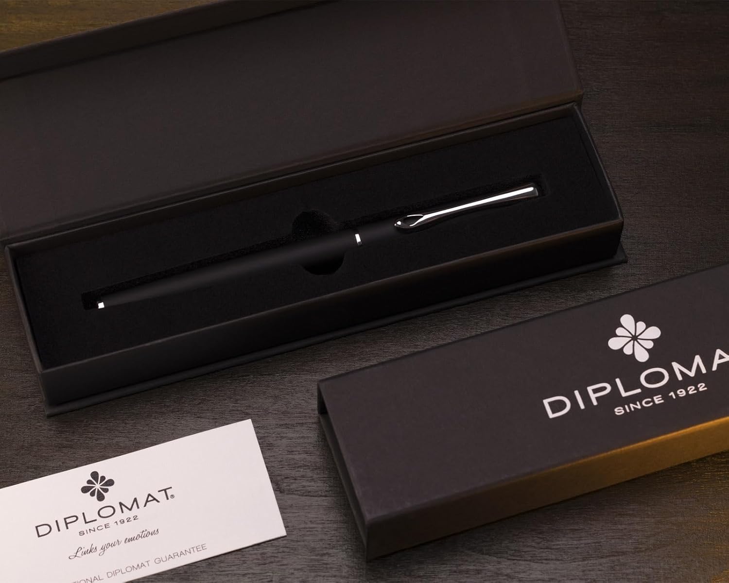 - EIN ELEGANTES SCHREIBSET für Freunde der Handschrift: der schlanke Füllhalter Traveller von Diplomat Schwarz matt mit Füllhaltertinte in Königsblau von Octopus Fluids (30 ml) und einem Tintenkonverter zum einfachen und umweltfreundlichen Befüllen.