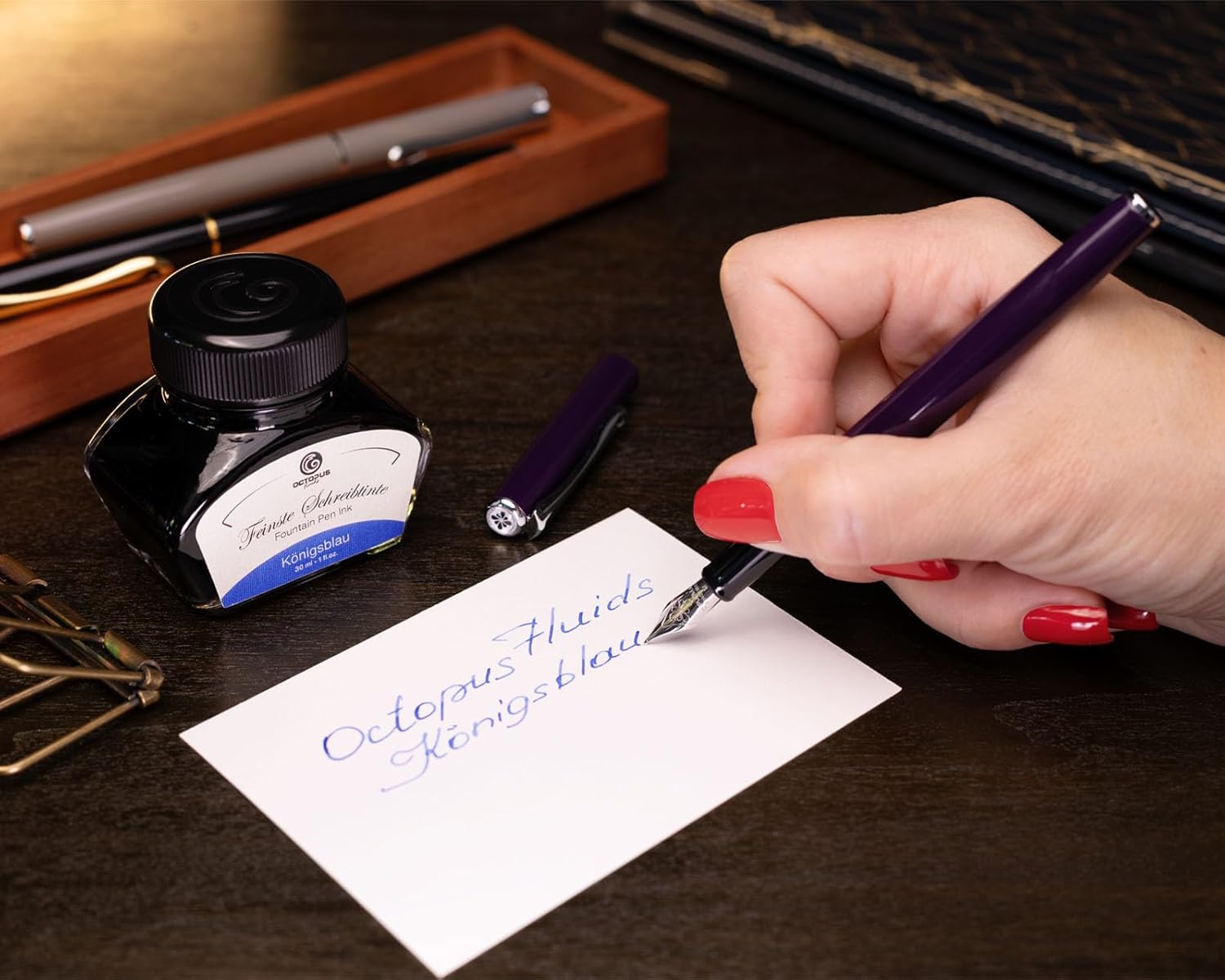 - EIN ELEGANTES SCHREIBSET für Freunde der Handschrift: der schlanke Füllhalter Traveller von Diplomat Deep Purple mit Füllhaltertinte in Königsblau von Octopus Fluids (30 ml) und einem Tintenkonverter zum einfachen und umweltfreundlichen Befüllen.