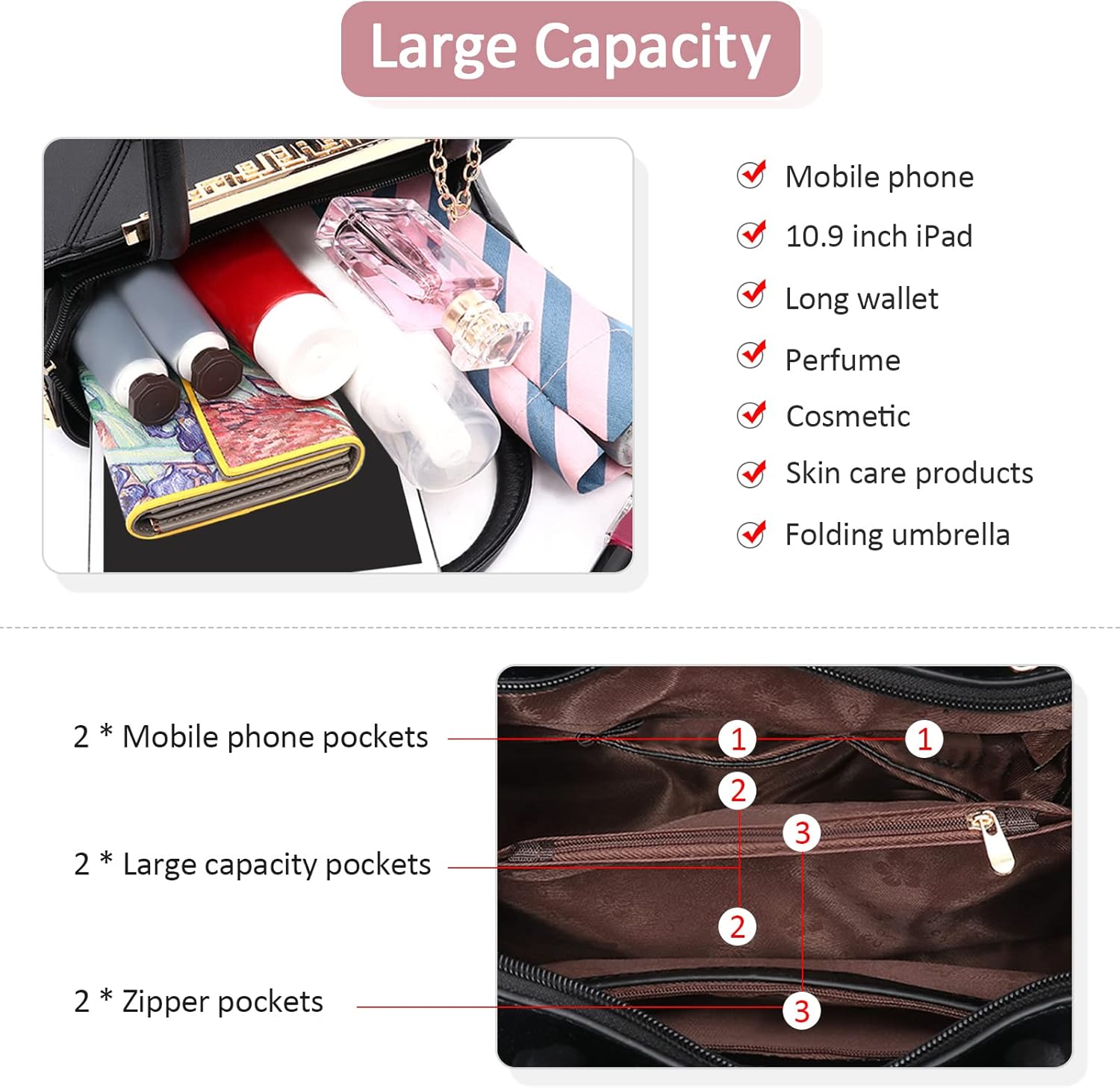 • Anwendbare Kapazität: 30 x 14 x 22 cm. Gewicht: 0.86 kg. Länge des langen Schultergurts: 120 cm. Diese Handtasche: 2 Haupttaschen, 1 seitliche Reissverschlusstasche, 1 kleine Reissverschlusstasche, 2 Seitentaschen, 1 hintere Reissverschlusstasche. Es