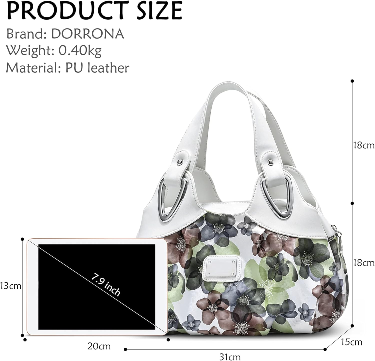 - Grösse: 31 x 15 x 18 cm. Gewicht: 0.40 kg. Grifflänge: 18 cm. Diese Handtasche: 1 Hauptfach mit reissverschluss, 2 seitentaschen mit magnetschnalle, 1 handytasche, 1 ausweistasche, 1 kleines reissverschlussfach. Kann handys, geldbörsen, schmuck,