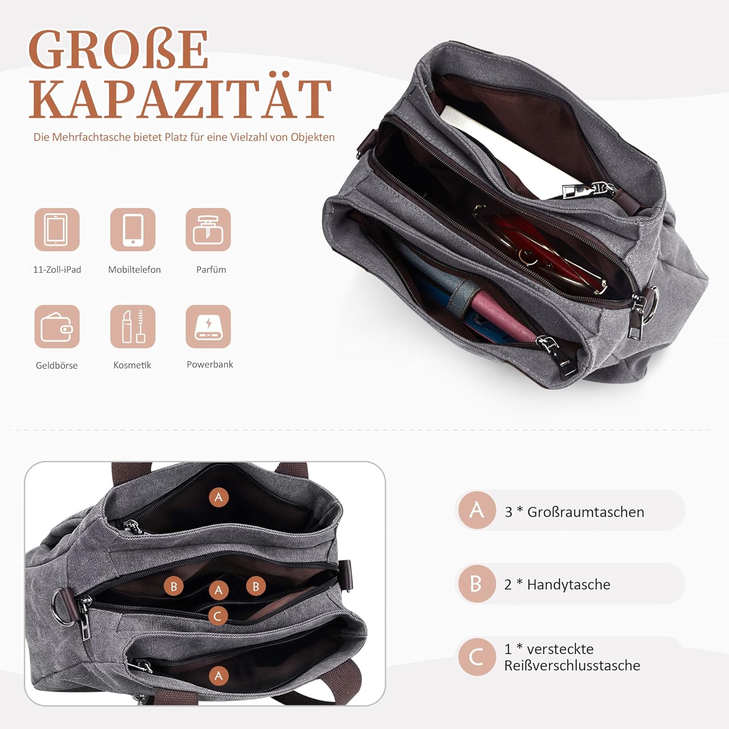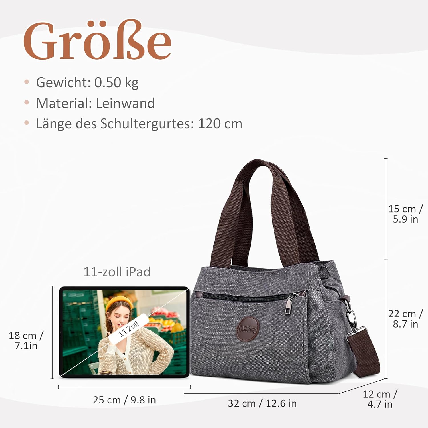 - Grösse: 32 x 13 x 22 cm. Gewicht: 0.50 kg. Länge des langen schultergurts: 120 cm. Diese handtasche: 3 grosse haupttaschen, 1 reissverschlusstasche, 2 handytaschen, 1 fronttasche mit reissverschluss. Es kann problemlos Ihre geldbörse, Ihren