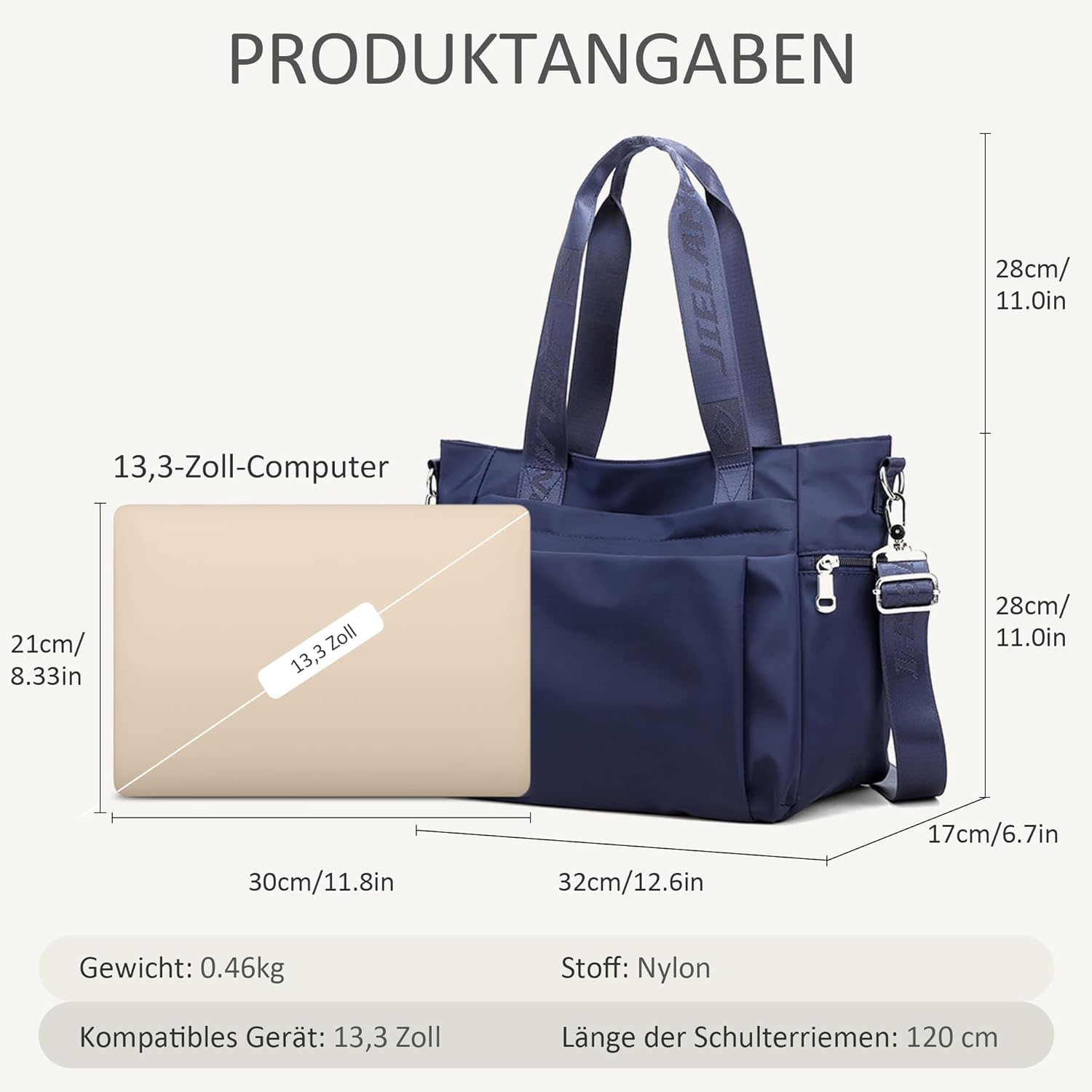 • Perfekte Grösse: 32 x 17 x 28 cm. Gewicht: 0.46 kg. Grifflänge: 28 cm. Diese Tasche hat insgesamt 9 Taschen: Aussen: 2 Seitentaschen, 2 Fronttaschen, 1 Reissverschlusstasche hinten; Innen: 1 Hauptfach, 2 aufgesetzte Innentaschen, 1