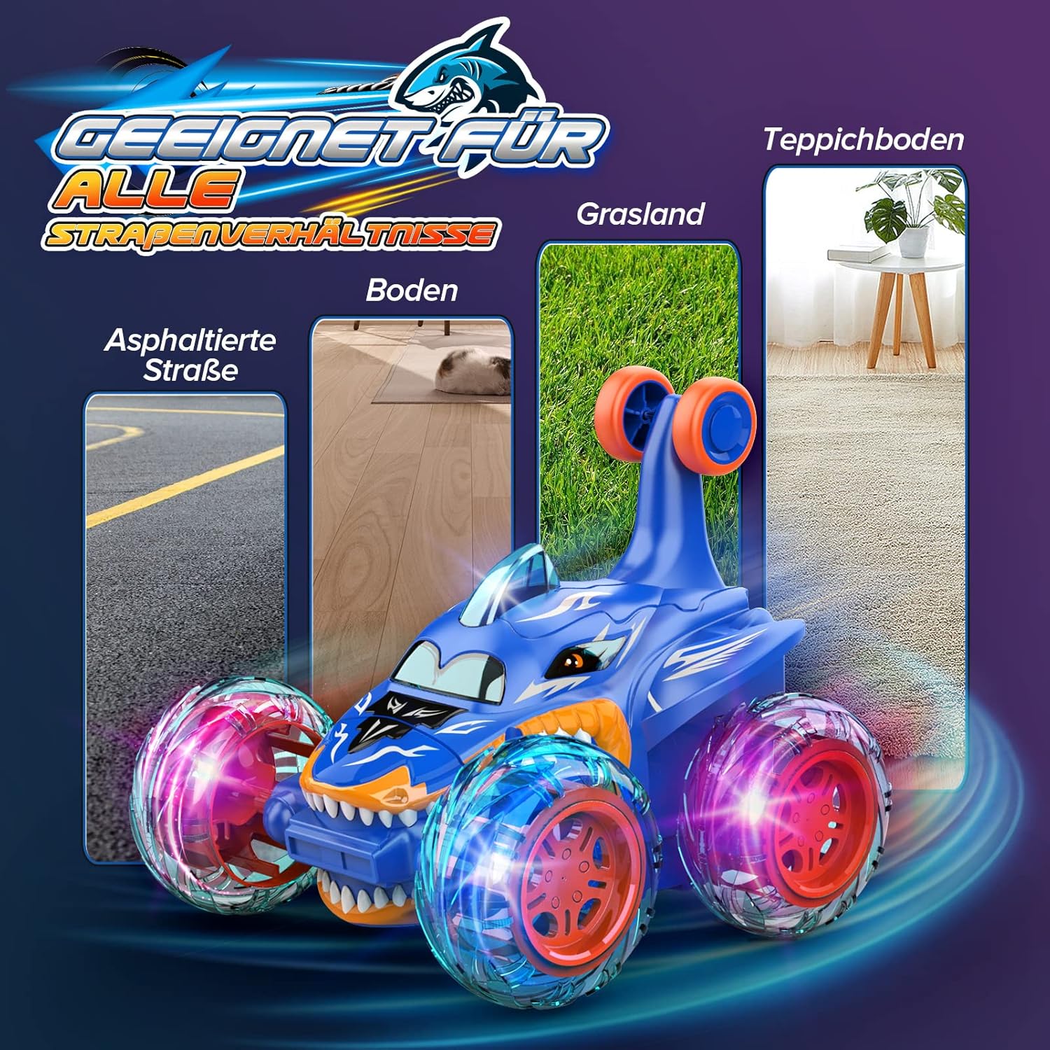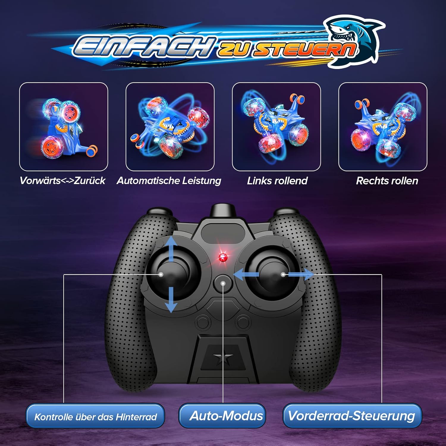 - 🦈【360°-Drehung Hai Ferngesteuertes Auto】Das Monstertruck verfügt über eine um 360 Grad drehbare Vorderachse, kann mit Leichtigkeit erstaunliche, ausgefallene 360°-Drehung ausführen. Die Räder und die Karosserie des ferngesteuerten Autos