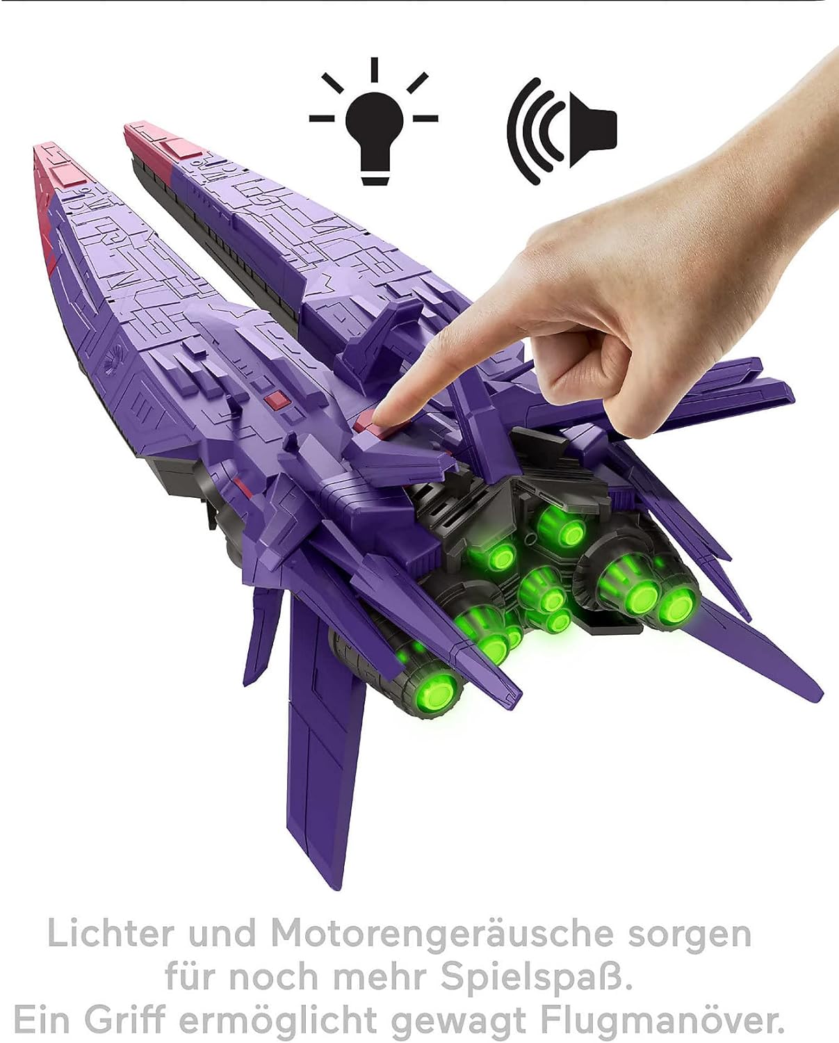 - Spannende Flug-Action! Wenn das Mutterschiff den Boden berührt, öffnet sich die Türe und ein Zyklopen-Roboter erscheint zum Überraschungsangriff! Das Mutterschiff umdrehen und neu aufladen