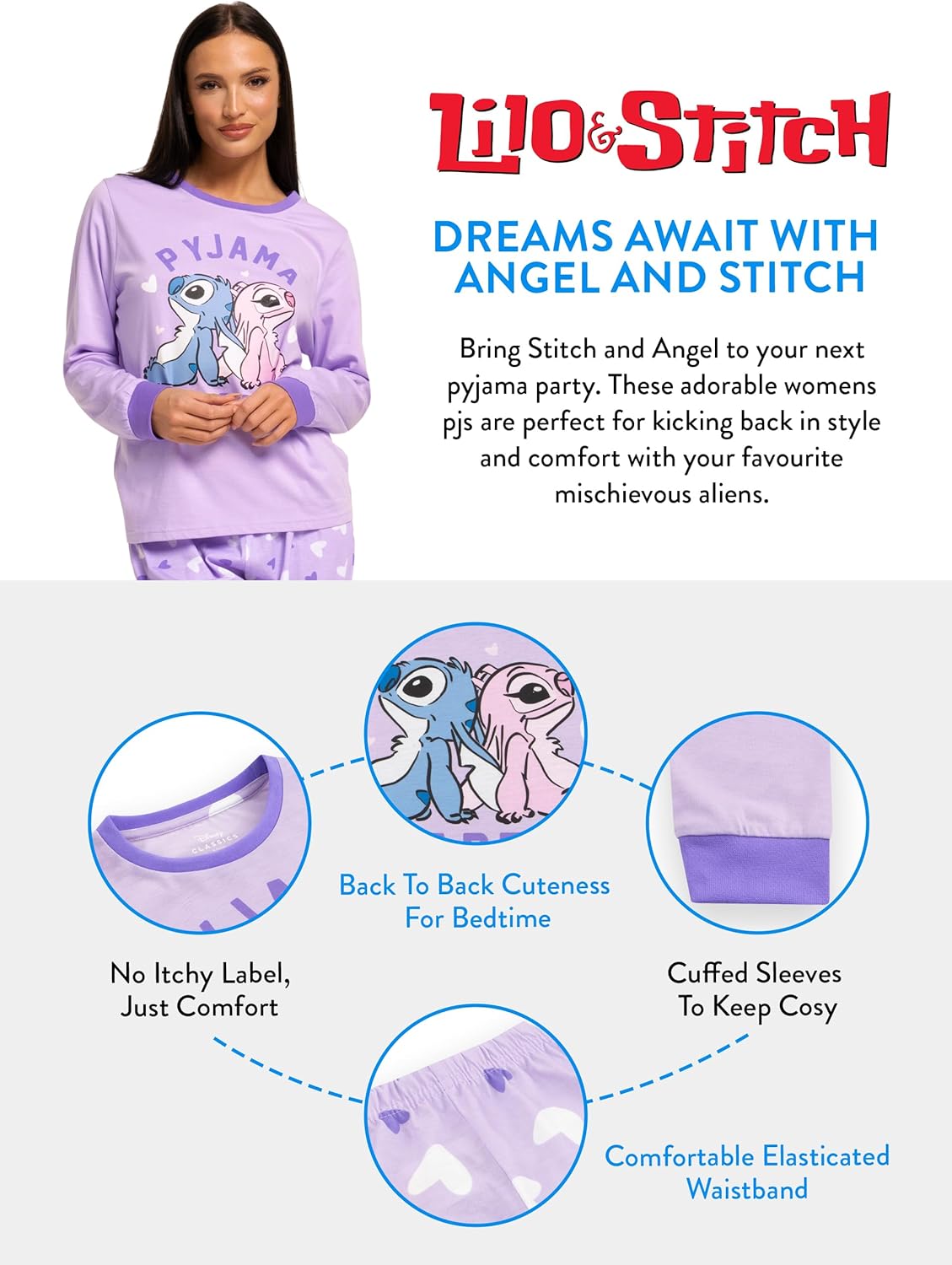 - Passende PJs Für Den Disney-Filmabend: Die passende Pyjama Stitch Hose ist mit einem stilvollen Muster aus lila-weissen Herzen bedruckt und verleiht diesem Stitch Schlafanzug Damen einen charmanten Look. Erhältlich auch in einer Mädchenversion für