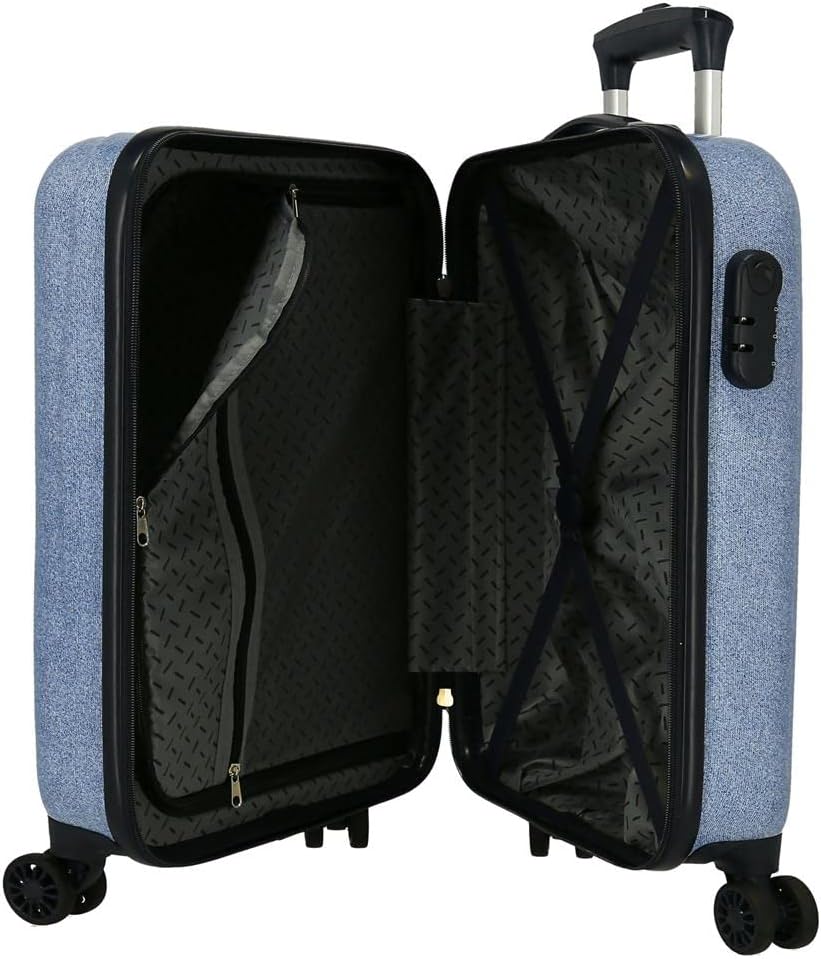 - Kabinentrolley 55 cm x 38 cm x 20 cm (Rollen und Griff im Lieferumfang enthalten). Er hat ein Fassungsvermögen von 34 l und wiegt 2,6 kg. Hergestellt aus ABS, einem steifen und leichten Material.