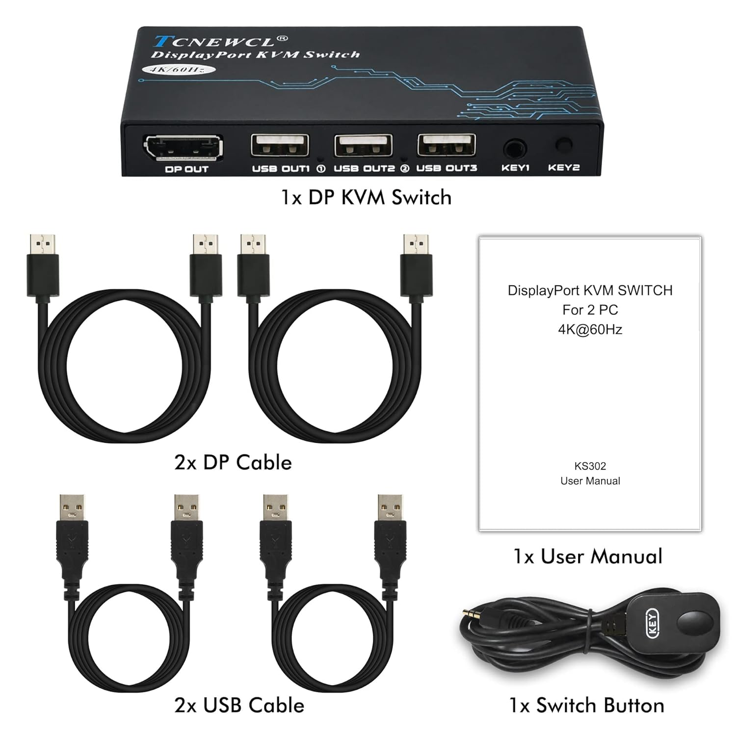 - 【Treiber kostenlos KVM DisplayPort -Switch】Plug and Play, es müssen nicht jedesmal Treiber installiert werden. Dieses Produkt wird mit 2 DisplayPort-Kabeln, 2 USB-Kabeln,1 Kabelgebundener Schalter, 1 Benutzerhandbuch.