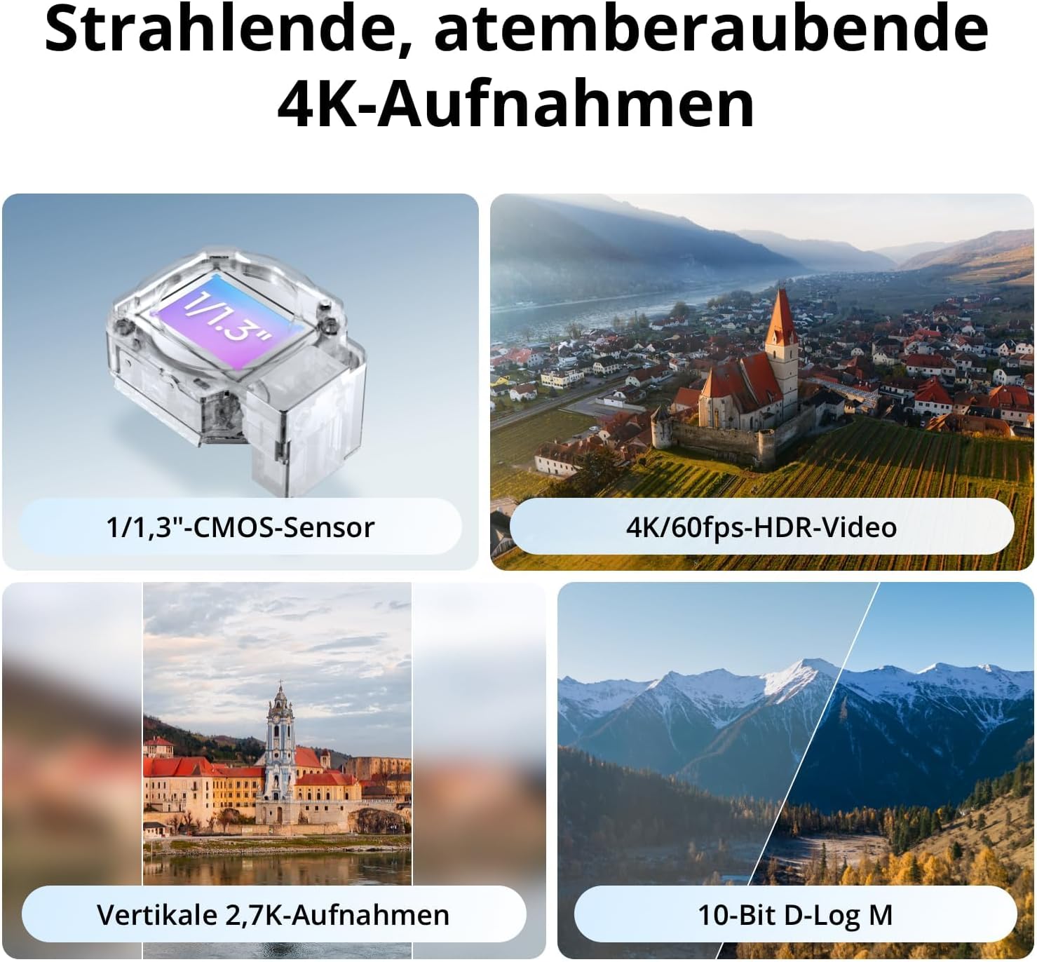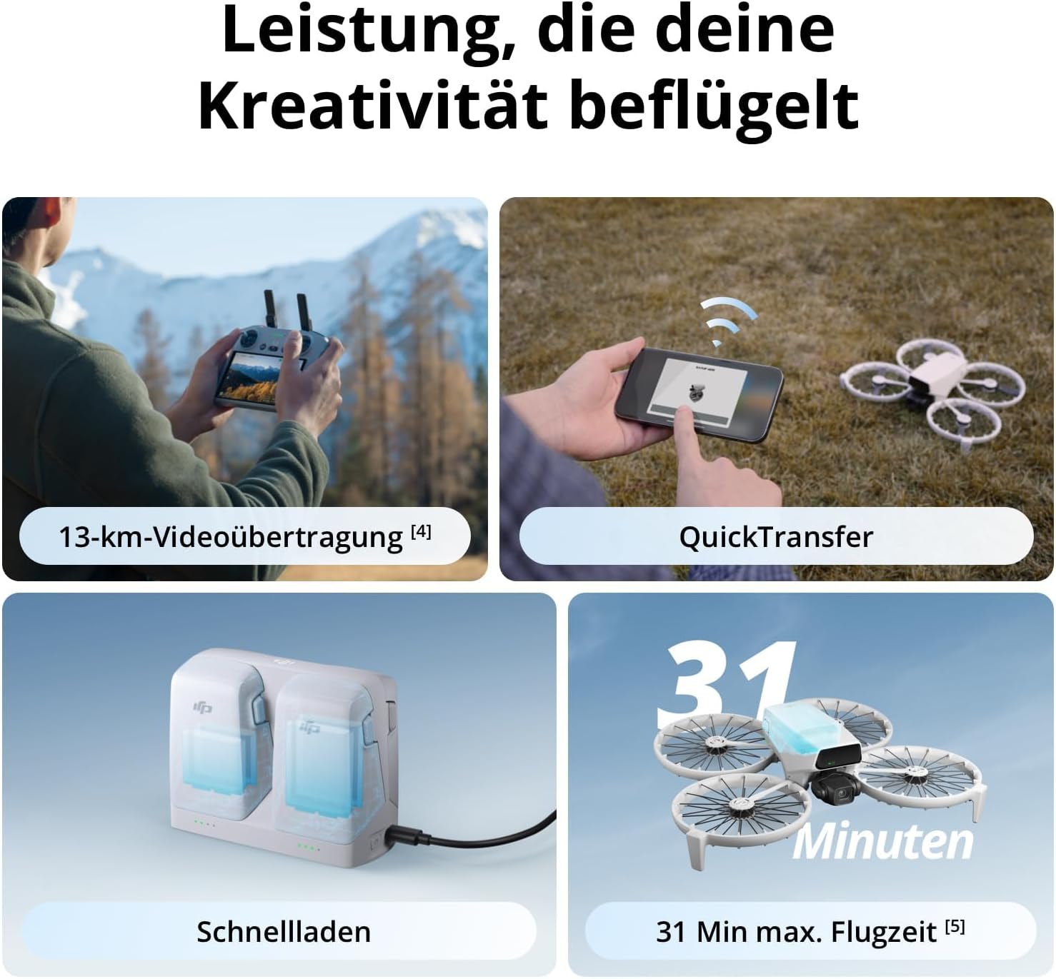 - Der grössere 1/1,3-Zoll-CMOS erfasst mehr Licht für klare, lebendige Details bei Tag und Dämmerung. Diese Kamera Drohne überzeugt bei Landschaften und Porträts; als Drohne mit Kamera 4K liefert sie saubere Ergebnisse mit feinem Kontrast.