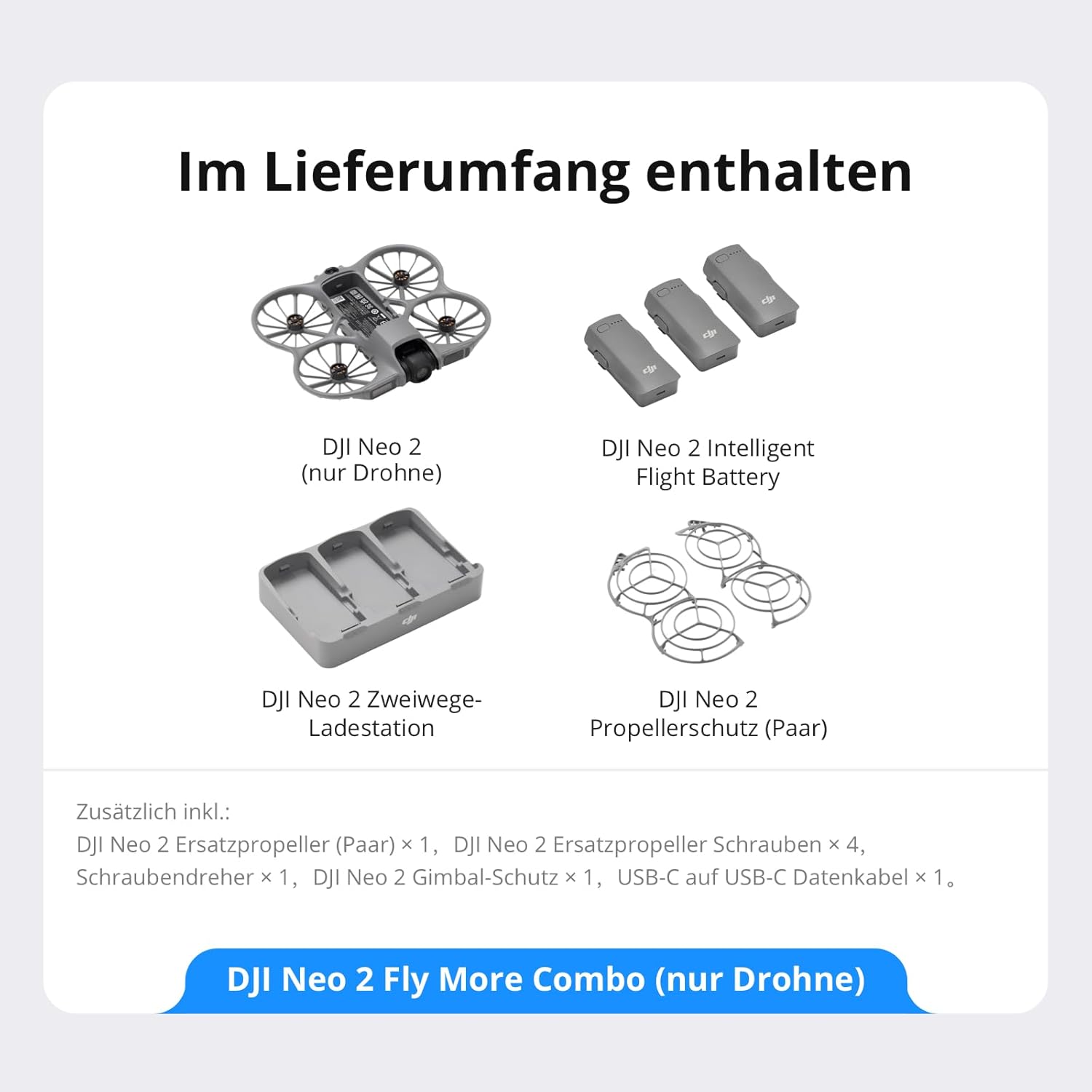 - Enthält die DJI Neo 2, drei Akkus, eine Ladestation, Propellerschutz und weiteres Zubehör für längere und einfachere Outdoor-Flüge.