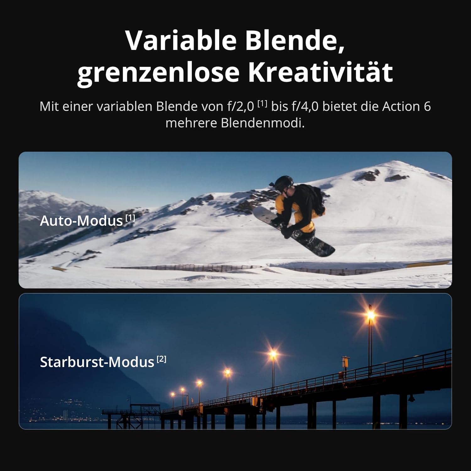 - Jede Szene einfangen, Tag oder Nacht – Die variable Blende von f/2,0 [1]–f/4,0 passt sich an, um kristallklare 4K-Aufnahmen bei jedem Licht zu ermöglichen. Ideal für dynamische Vlogs, Sport und kreative Aufnahmen mit deiner Action-Cam.