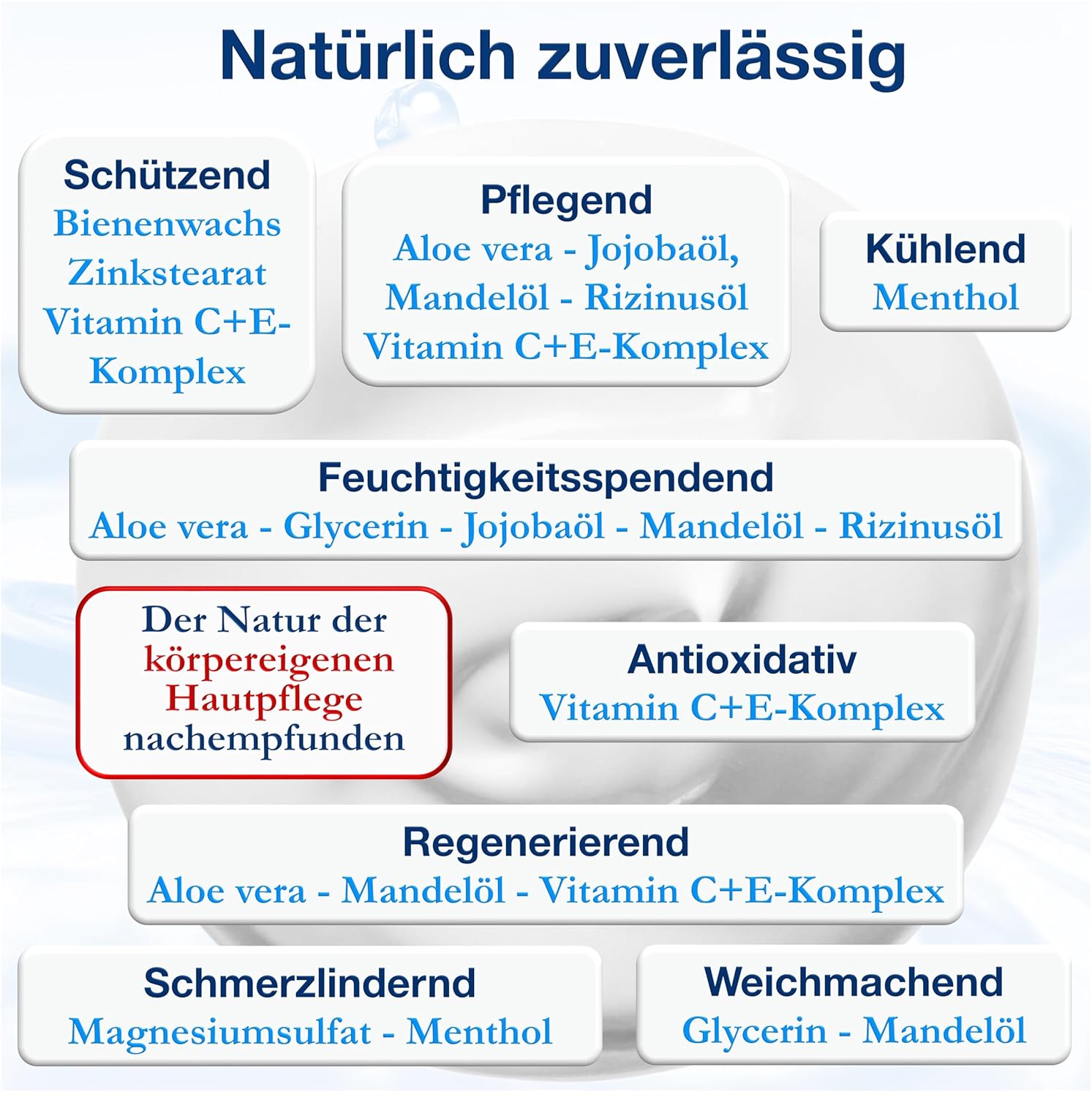 - Wohltuende Inhaltsstoffe: Hochwertige Öle wie Jojobaöl, Mandelöl, Rizinusöl und Vitamin C+E-Komplex verleihen deiner Haut Kraft und Elastizität zurück. Aloe vera, Bienenwachs, Glycerin, Menthol beruhigen irritierte Bereiche und lindern Juckreiz.