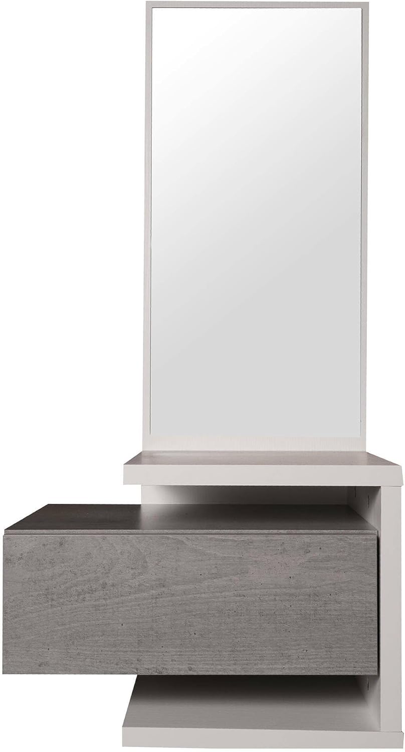 - FLURMÖBEL – Strukturierte Hängemöbel mit einer betonfarbenen Schublade und einem kleinen weissen Regal mit Spiegel – Ganz in Weiss und Beton mit passendem Spiegel