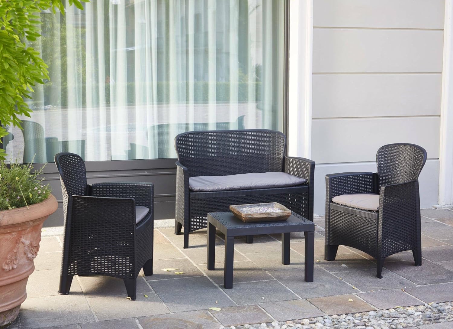 - OUTDOOR-LOUNGE-SET OSTUNI - Gartengarnitur mit 2 Sesseln, 1 Sofa und 1 Couchtisch, Sitzecke in Rattan-Optik mit Kissen, 100 % Made in Italy, Anthrazit