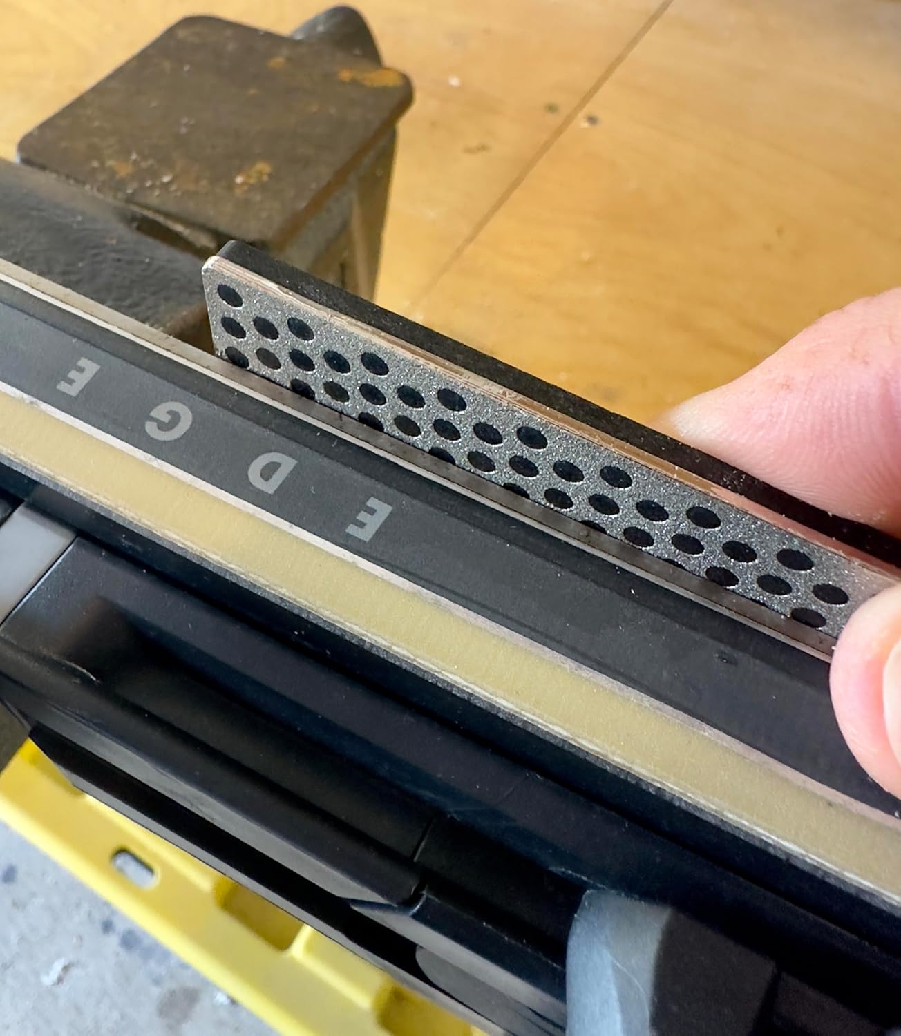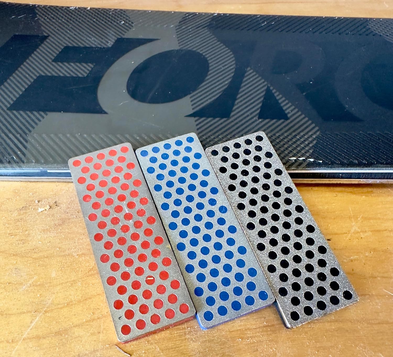 - Drei verschiedene Diamantsteine: extra-grob zur Reparatur einer beschädigten Kante, grob zum Schleifen einer abgenutzten Kante und fein zum Schleifen einer rasiermesserscharfen Kante.