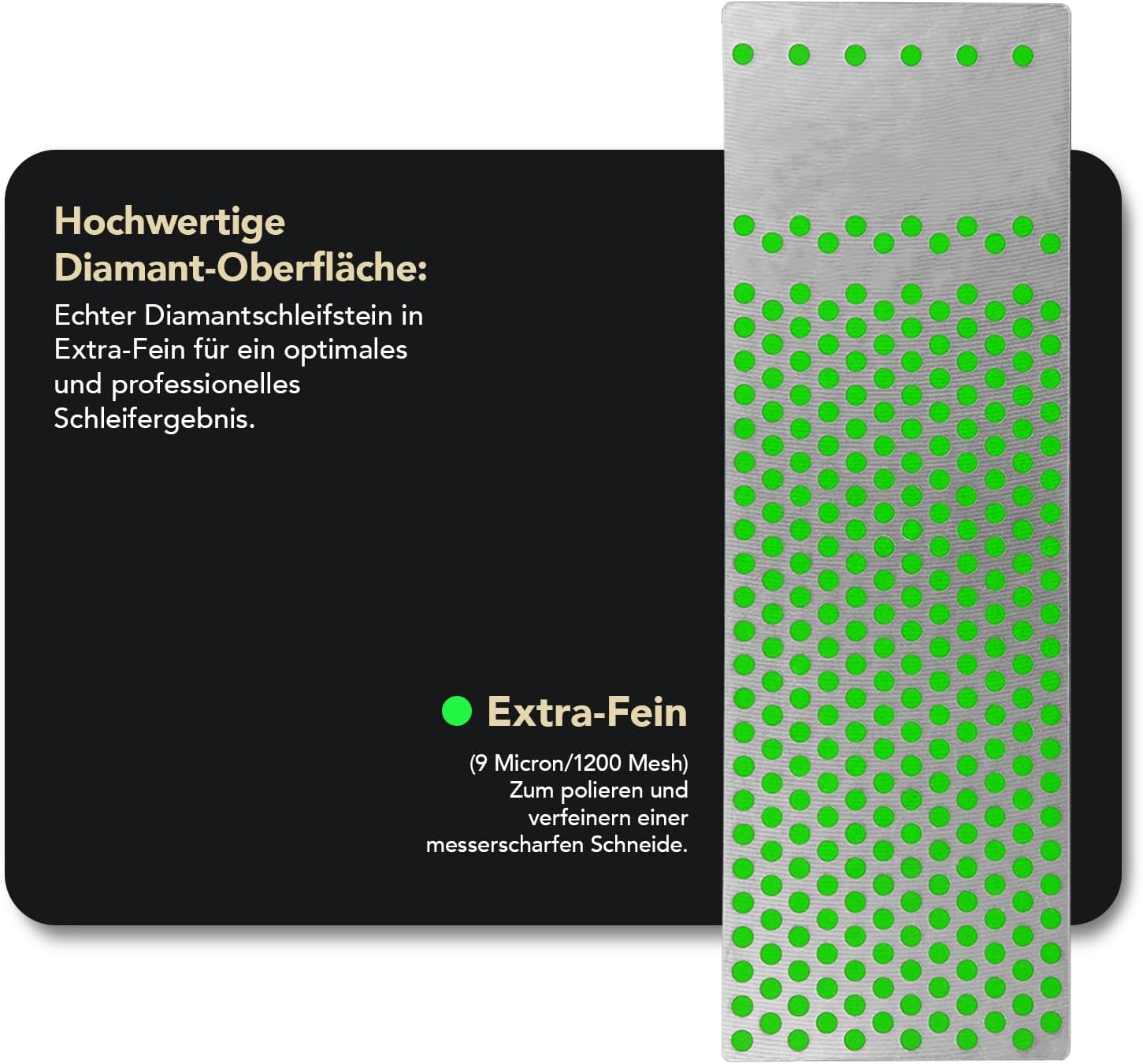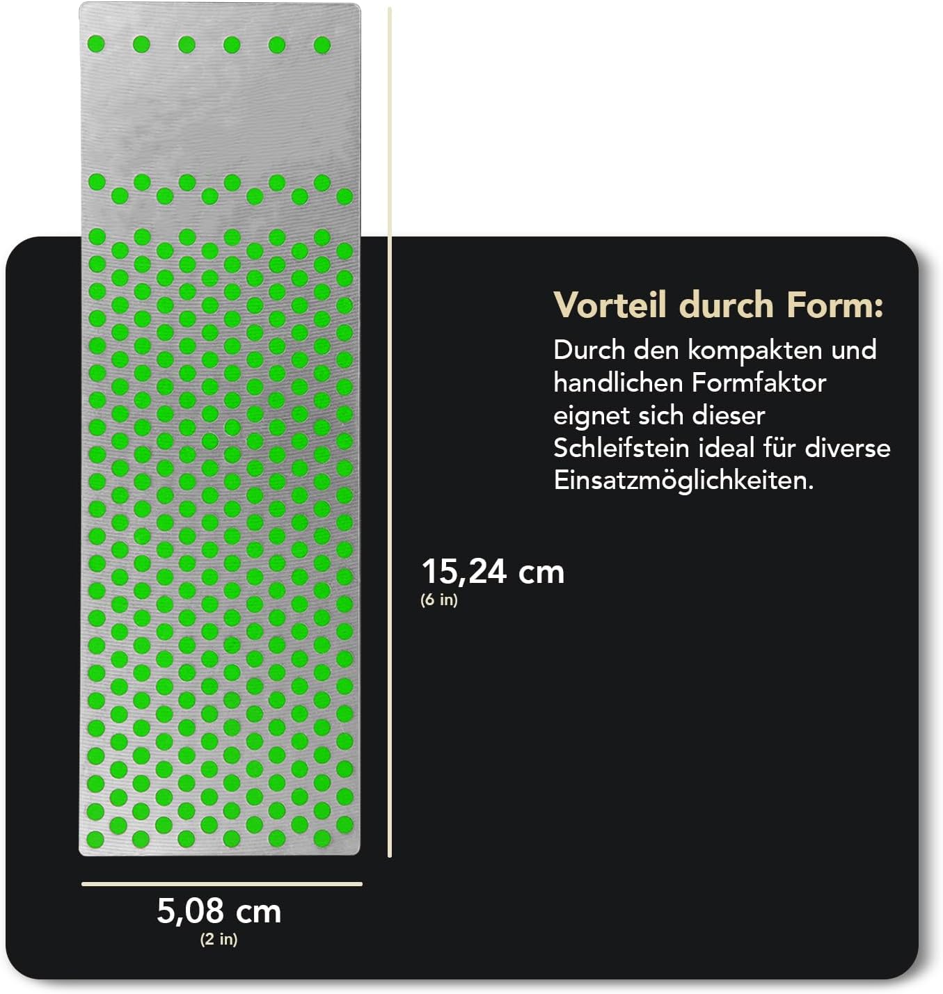 - Extrafeiner Diamant zum Polieren und Glätten einer Schneide. Bietet zusätzlich eine kontinuierliche Zone für kleine und spitze Werkzeuge.