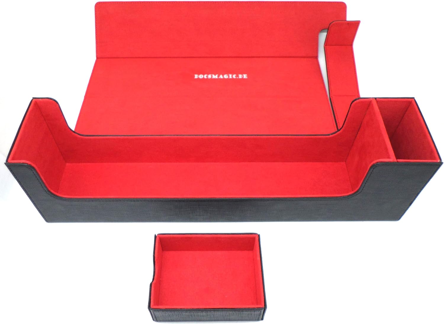 - Passend für z.B.: 4 Magnetic Flip Boxen; 5 Deck Boxen 80+; 7 Standard Standard Deck Boxen; 630 Karten in Premium Hüllen (+60 im kleinen Fach ohne Behälter); 210 Toploader.