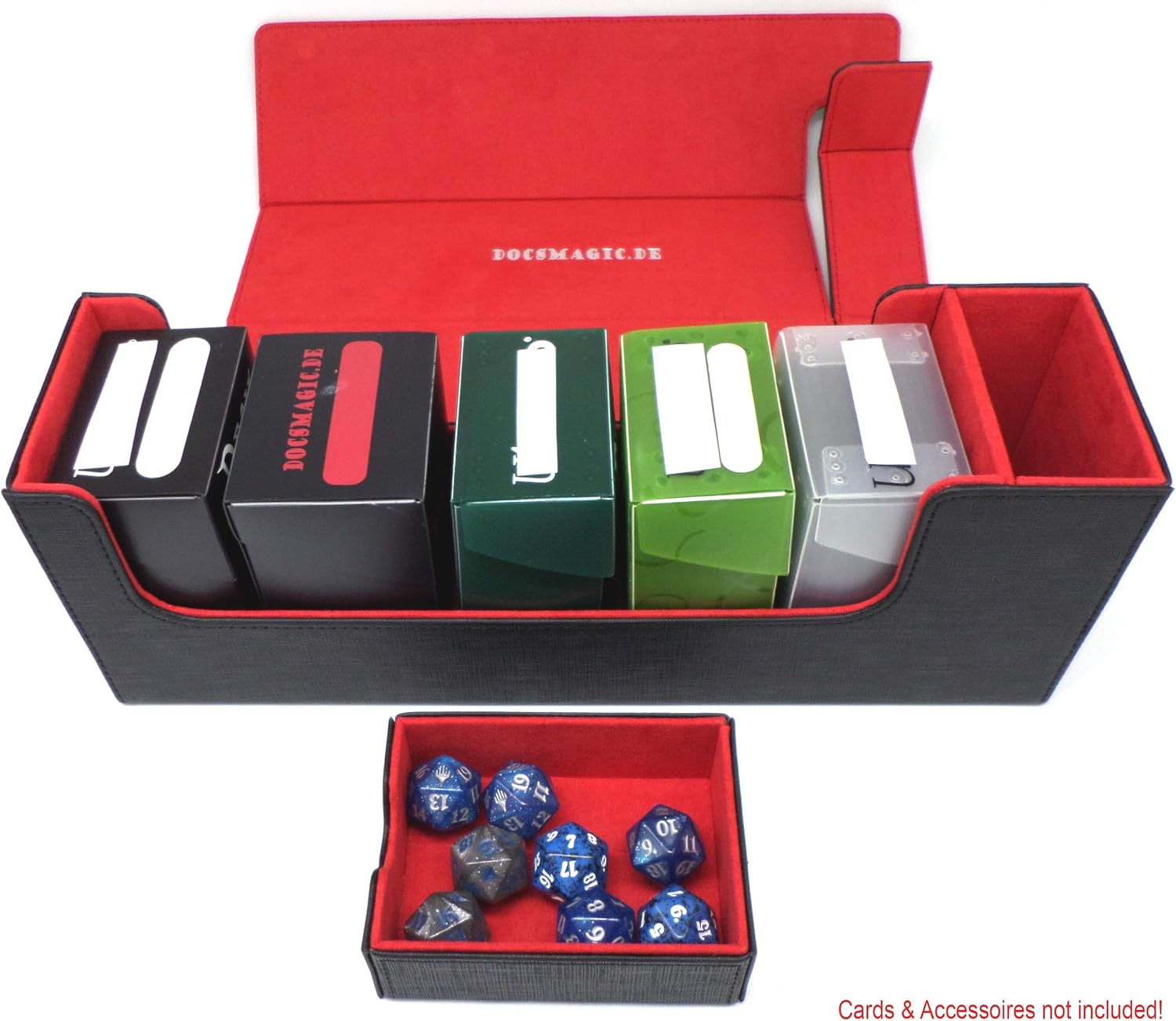 - Passend für z.B.: 3 Magnetic Flip Boxen; 4 Deck Boxen 80+; 5 Standard Standard Deck Boxen; 490 Karten in Premium Hüllen (+60 im kleinen Fach ohne Behälter); 160 Toploader...