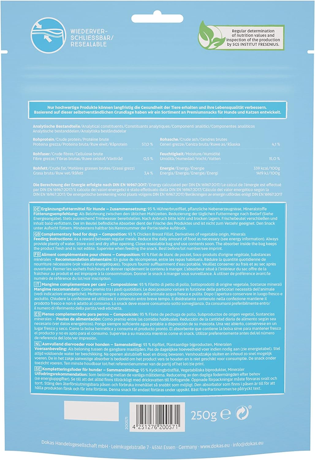 - Lieferumfang: 1 x 250 g DOKAS Hühnerbruststreifen / Premium Leckerli aus 100% Hühnerbrust im Fleischanteil / Ergänzungsfuttermittel für Hunde mit Mineralstoffen / SGS Institut Fresenius geprüft