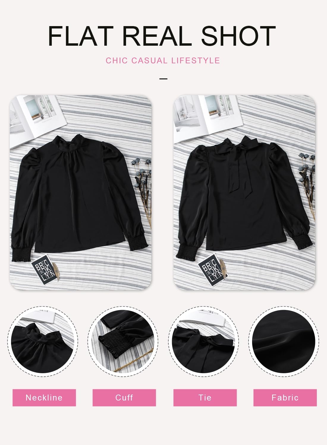 - Elegante Chiffonbluse Langarm Blusen mit Puff Ärmel, Stehkragen, Binde-Schleife hinten