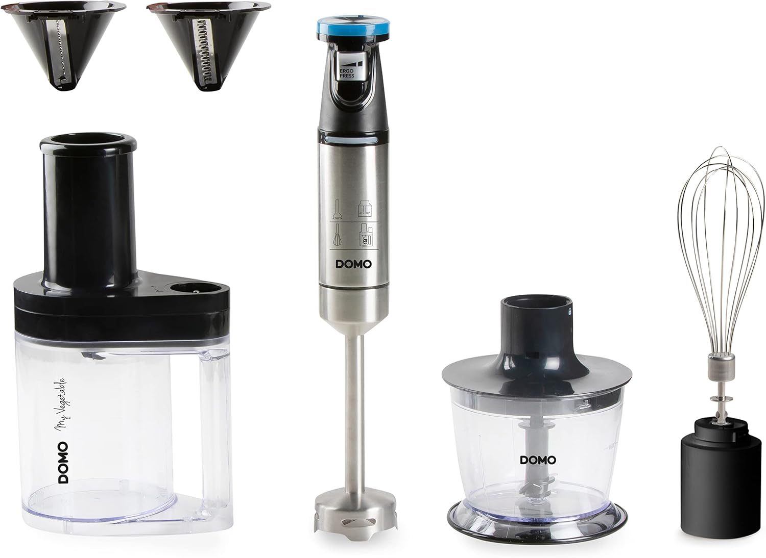 - VIELSEITIGE STABMIXER SET – Mit Mixstab, Schneebesen, Zerkleinerer & Spiralschneider ist der DOMO Stabmixer perfekt für Suppen, Dips, Schlagsahne oder Gemüsenudeln geeignet