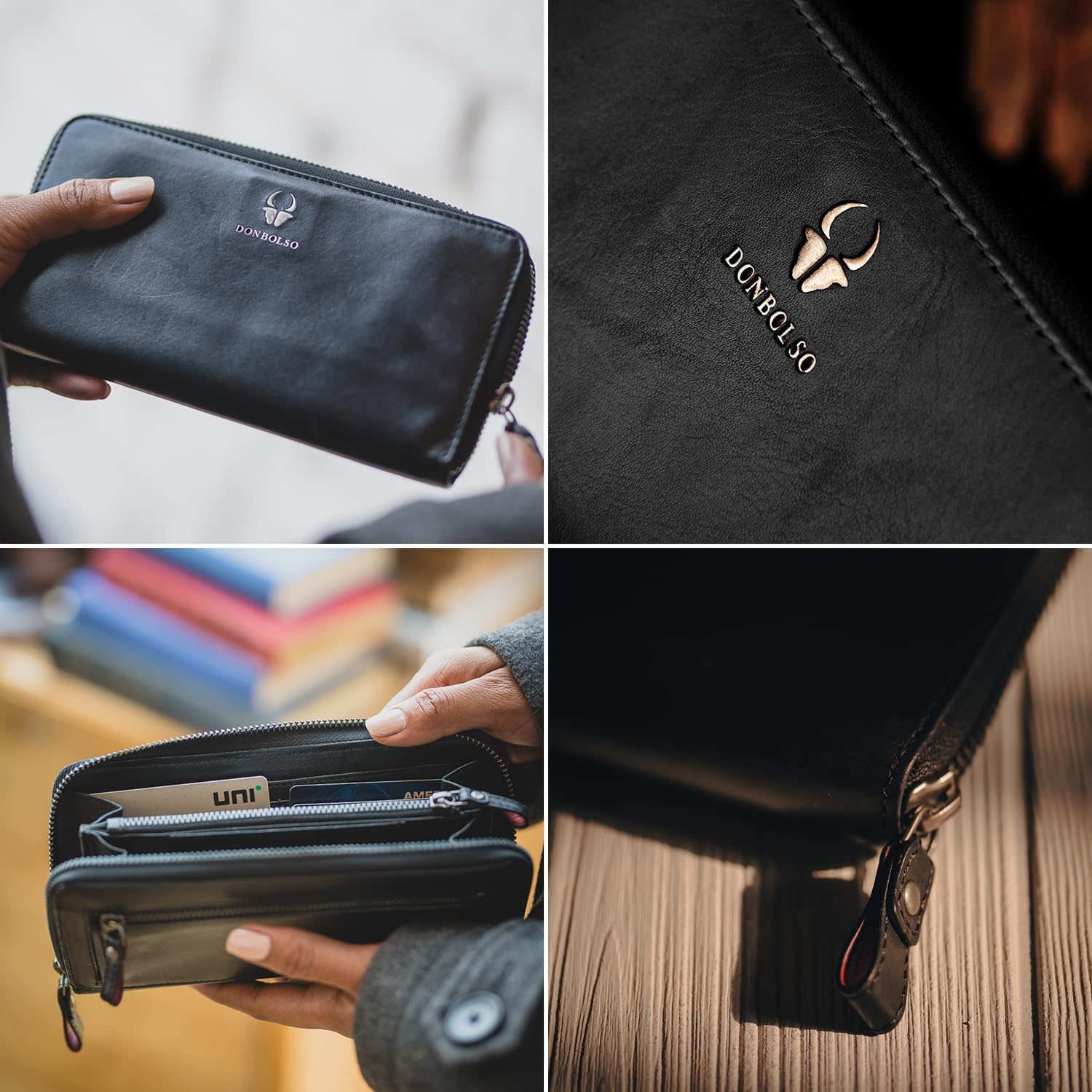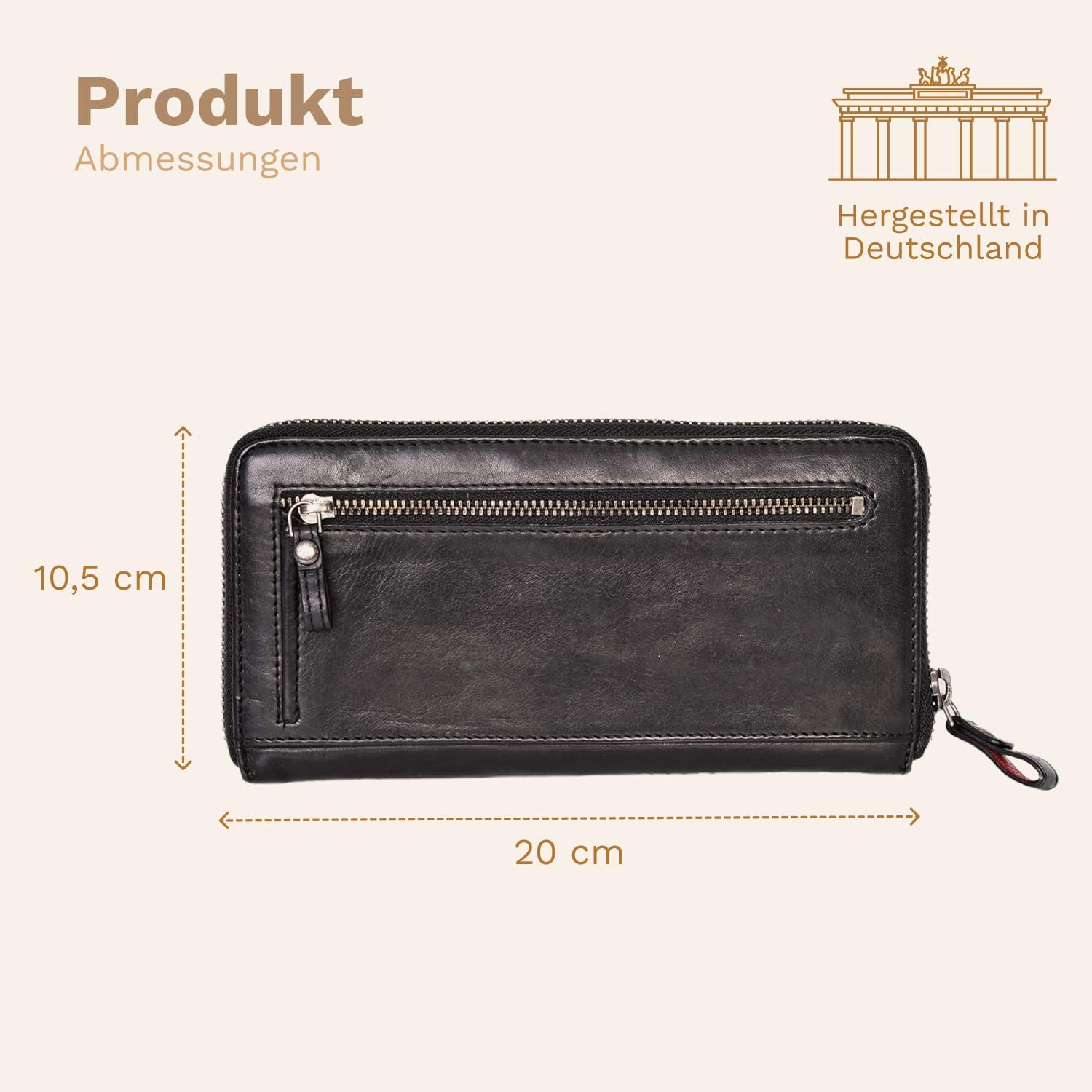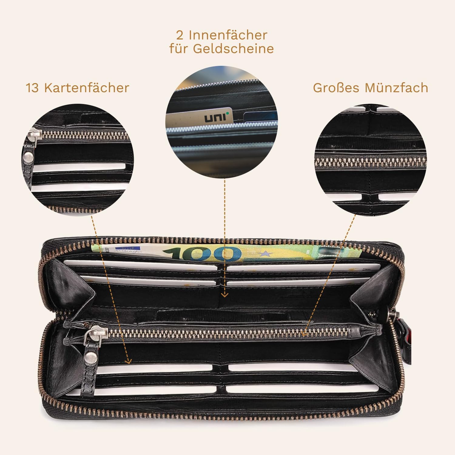 - FUNKTIONAL - Ein weit zu öffnendes Münzfach, 13 Kartenfächer, zwei Innenfächer für Scheine, Dokumente oder Smartphone. Sowie ein extra Fach auf der Rückseite. RFID- und NFC-Blocker eingebaut.