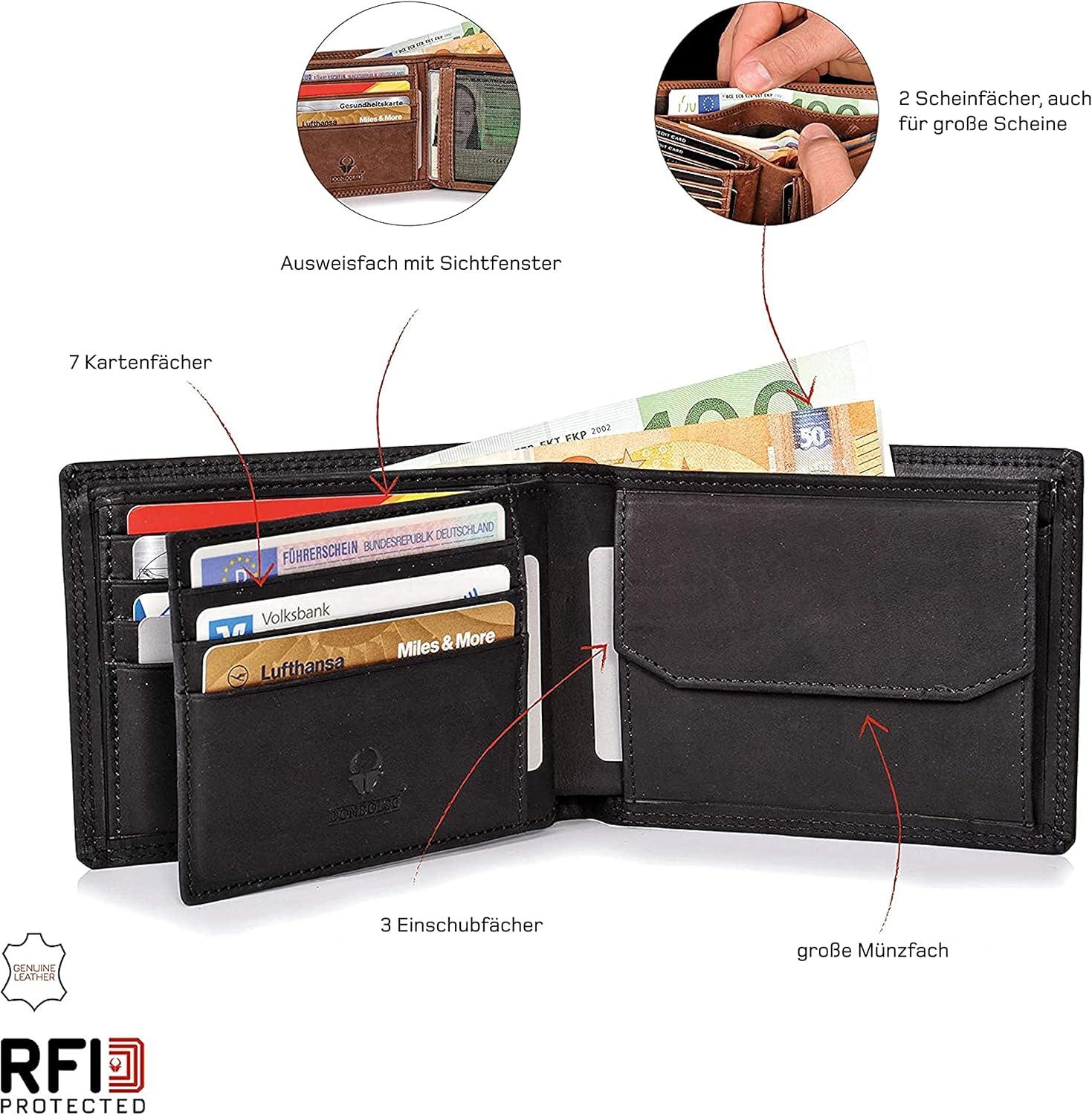 - NFC BLOCKER - Dank RFID Blocking sind deine Kreditkarten und EC-Card in diesem Ledergeldbeutel vor Datendiebstahl sicher und im Doppelscheinfach bleiben auch grosse Scheine von Rechnungen getrennt.