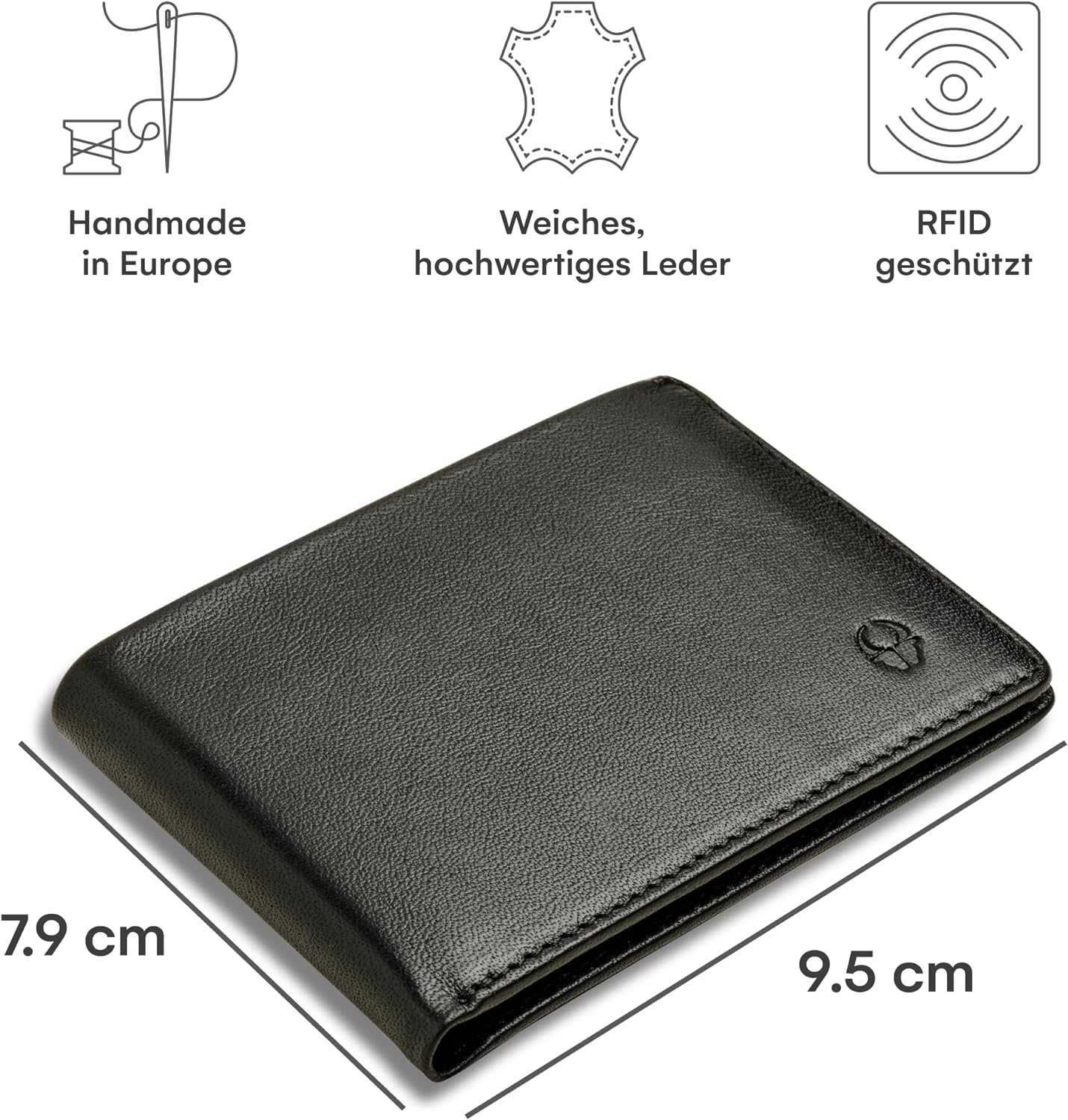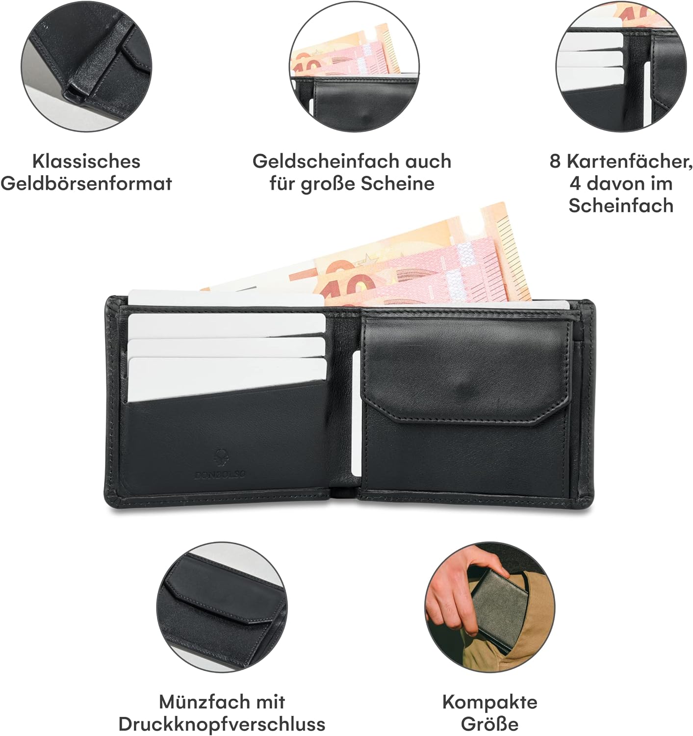 • ABSOLUT GERÄUMIG – Insgesamt 7 Fächer bieten Platz für alle Karten & den Ausweis. 4 der Kartenfächer sind im Scheinfach integriert. Zusätzlich bietet die Männer Geldbörse ein grosses Münzfach.