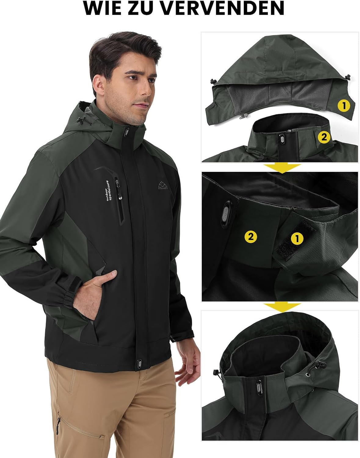 - Regenjacken mit Kapuze: Abnehmbare und verstellbare Sturmkapuze. Versteckter Klettverschluss im Kragen. Mit robusten, flexiblen Reissverschlüssen, verstellbaren Klettbündchen und unterem Kordelzug, um Sie besser anzupassen und Wind und Wasser