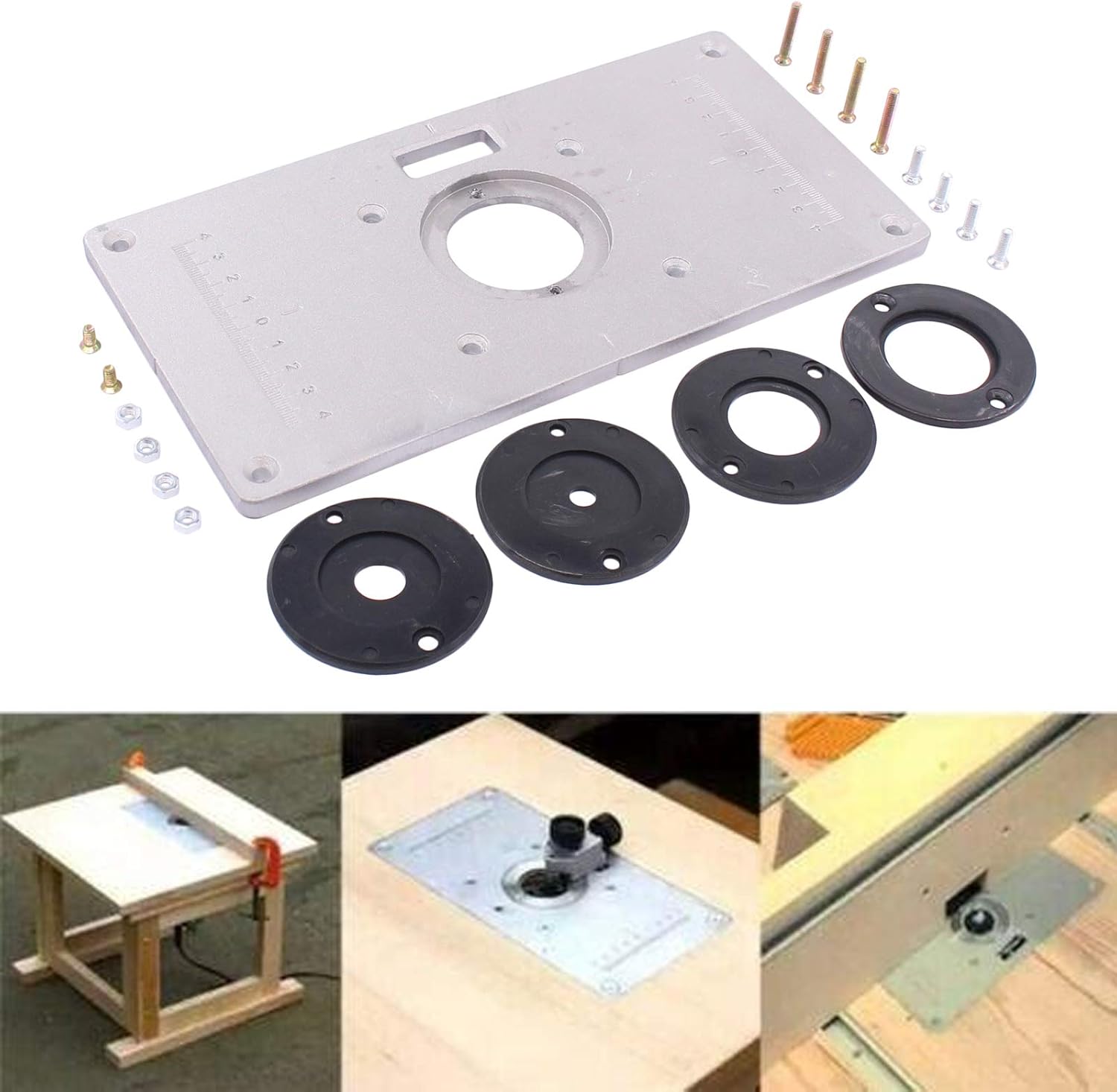 - Lieferumfang:1x Router Tischeinsatzplatte;1x Schraubensatz;4x Ringe einfügen