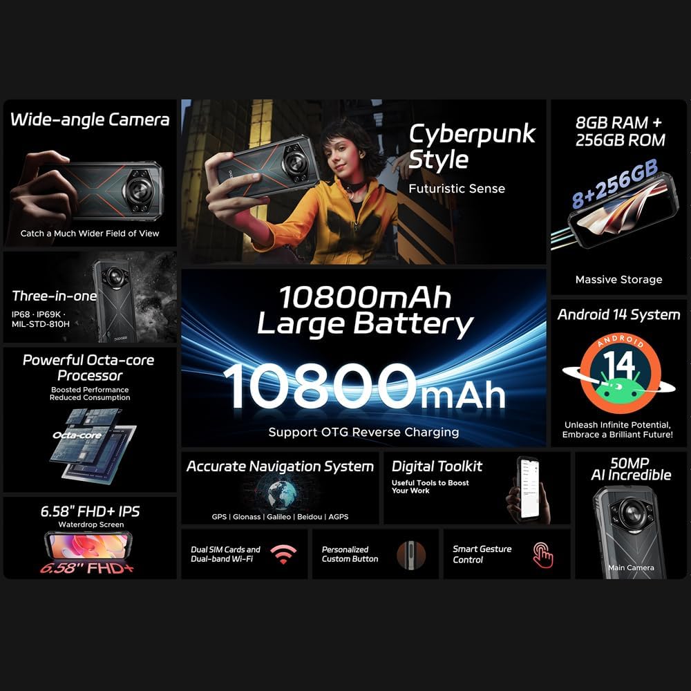 - 【GPU Mali-G57 und Android 14】 Das robuste Telefon Doogee S Cyber wird durch einen Herstellungsprozess der Klasse 12 nm, Octa-Core Mali-G57 GPU verarbeitet. Das Cyber DOOGEE S-Telefon läuft auf Android 14 und gewährleistet einen reibungslosen und