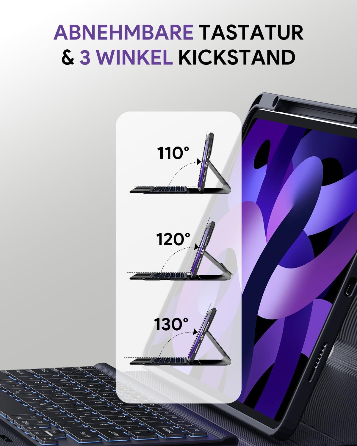 - Abnehmbar & Winkel Einstellbar - Die kabellose Tastatur wird magnetisch mit der Schutzhülle verbunden. Bei der Hülle ist auch 3 Winkel verfügbar, Sie könnten den Winkel nach unterschiedlichen Gebrauchsnachfragen einstellen.