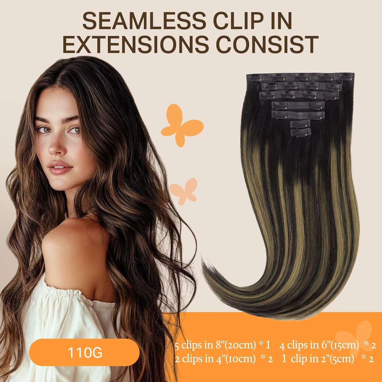 DOORES Clip in Extensions Echthaar, Balayage Natürliches Schwarz bis Chestnut Braun 35cm 14 Zoll 7 S
