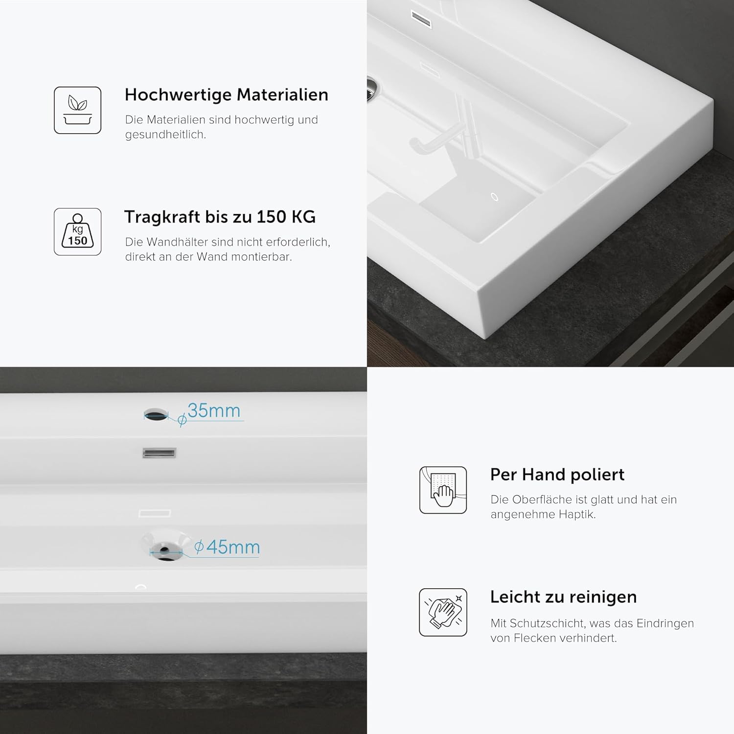 - Das Waschbecken kann sowohl an der Wand als auch auf einem Waschtisch montiert werden.